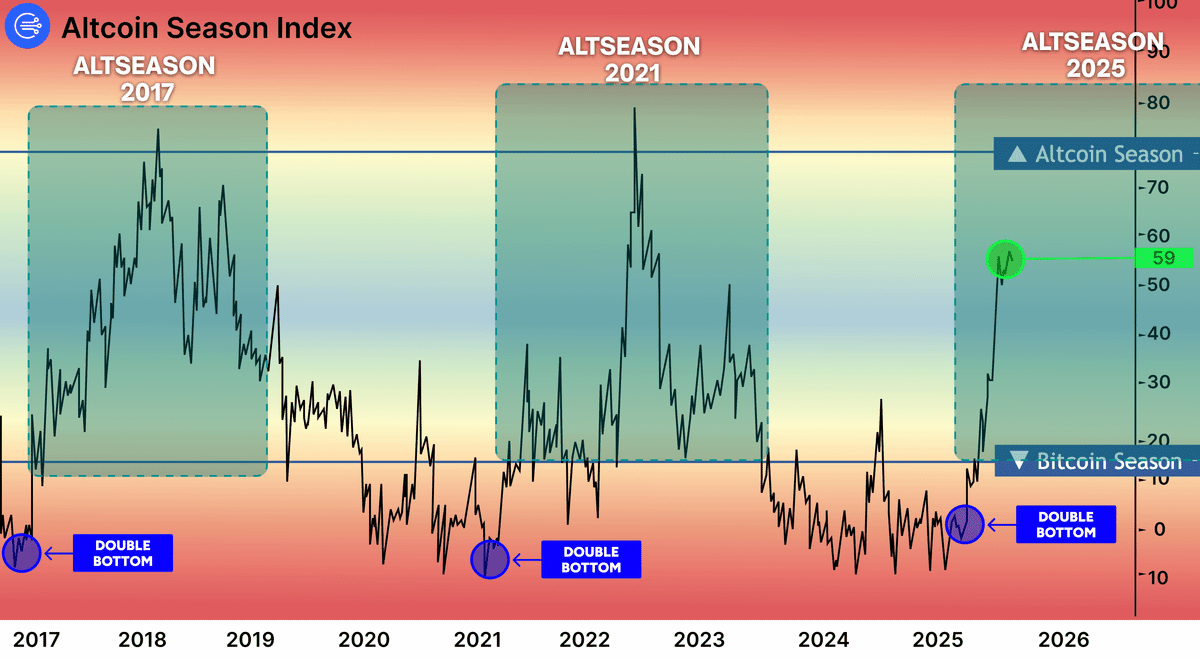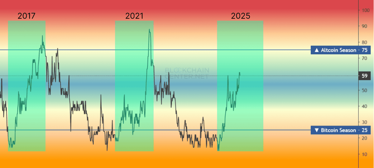 𒀭 1. Индекс альтсезона вырос до 59, и это ключевой сигнал, который в предыдущих циклах приводил к самым сильным движениям альткойнов