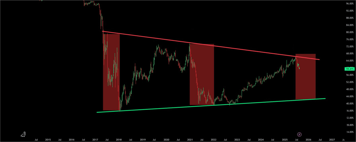 𒀭 2. Ситуация дополнительно подтверждается падением доминирования Биткойна, что указывает на системный сдвиг капитала в альткойны