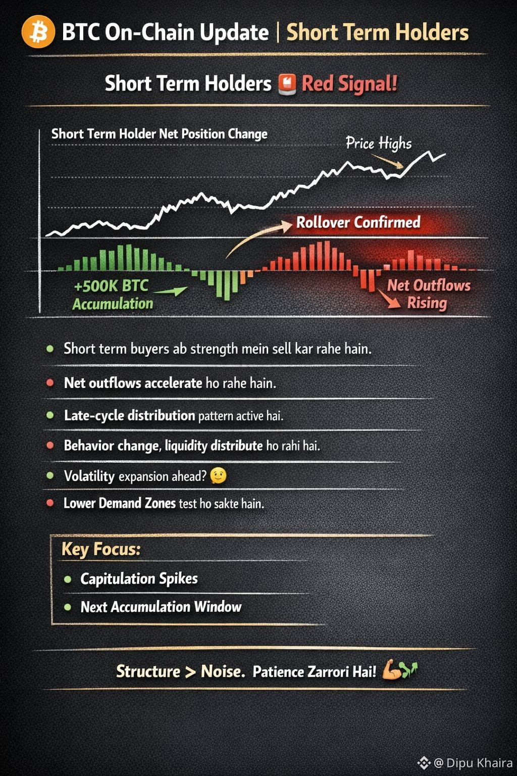 1/ Short Term Holder Net Position Change ne strong accumulation phase ke baad rollover confirm kar diya hai.