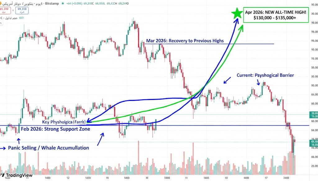 حالياً، يتداول البيتكوين في نطاق يتراوح بين 68,000 و 80,000 دولار. هذه المرحلة تُعد حجر الأساس؛ حيث يتم امتصاص ضغوط البيع الناتجة عن جني الأرباح في العام الماضي. الحفاظ على مستوى الدعم عند 70,000 دولار هذا الشهر هو الإشارة الأولى لبدء رحلة الصعود.