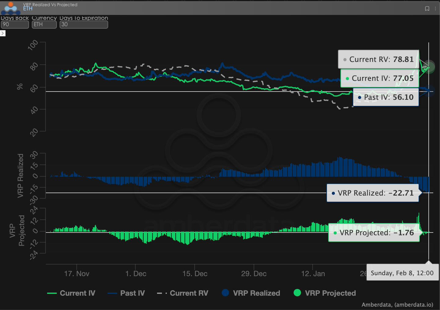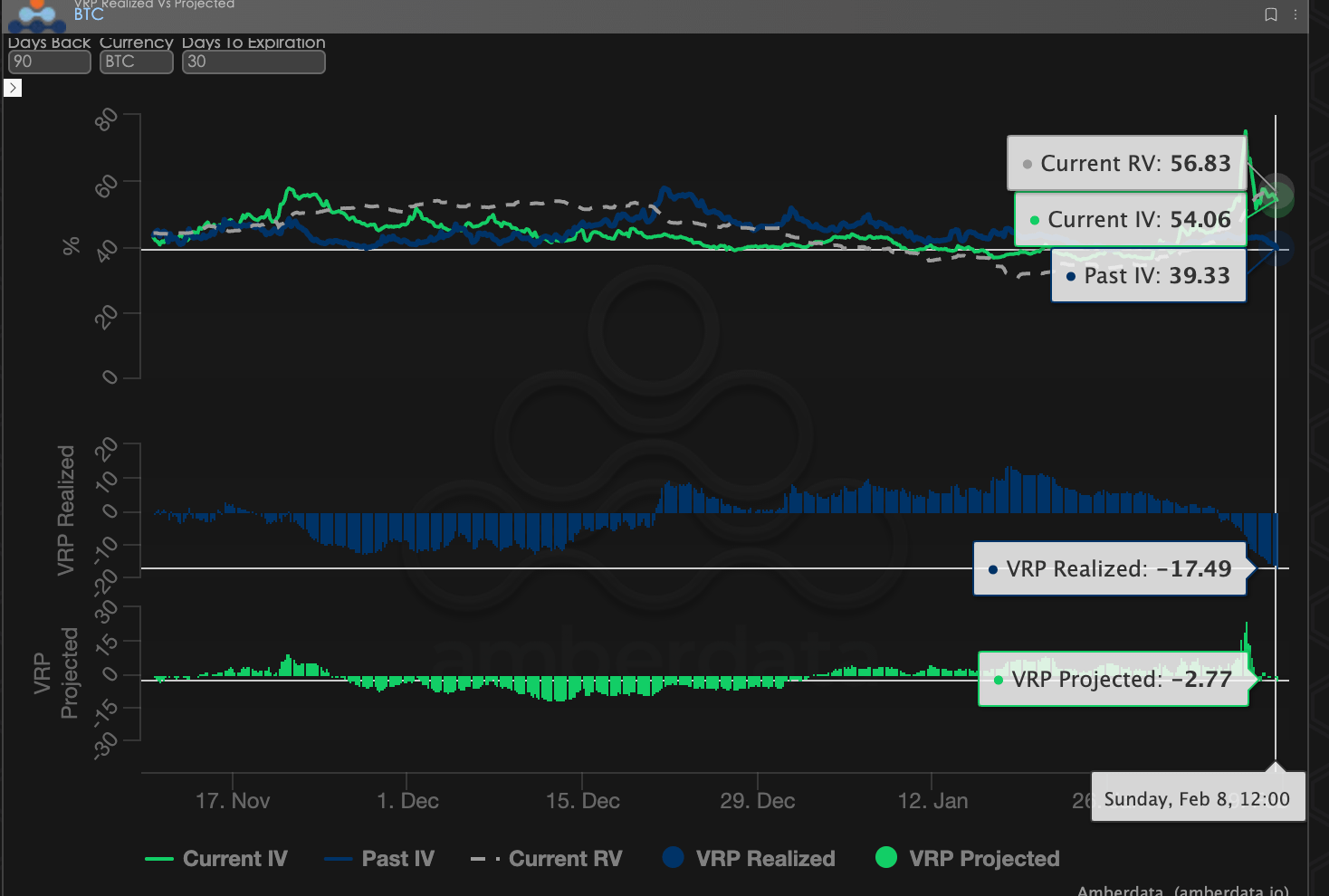 VRP (волатильность риск-премия = подразумеваемая волатильность IV - реализованная волатильность RV) является важным показателем оценки разумности ценообразования опционов. Текущий рынок находится в стадии коррекции.