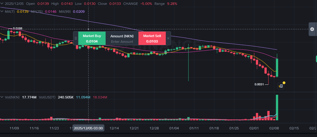 Сеть и знания (NKN) стали одной из криптовалют, которая привлекла внимание к волатильности в недавней рыночной активности. На основе последних живых данных пара NKN/USDT на крупных биржах, таких как Binance, торгуется около $0.005–$0.006, при этом краткосрочные движения показывают слабость и сжатие диапазона — что соответствует более широкому сокращению криптосентимента.