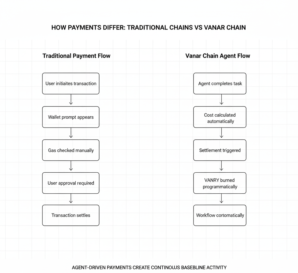Most networks see payment activity correlate tightly with user activity. When people aren't actively using applications, payment volume drops. When interest fades, settlement activity disappears. Vanar Chain's agent-driven settlement baseline operates regardless of whether humans are paying attention.