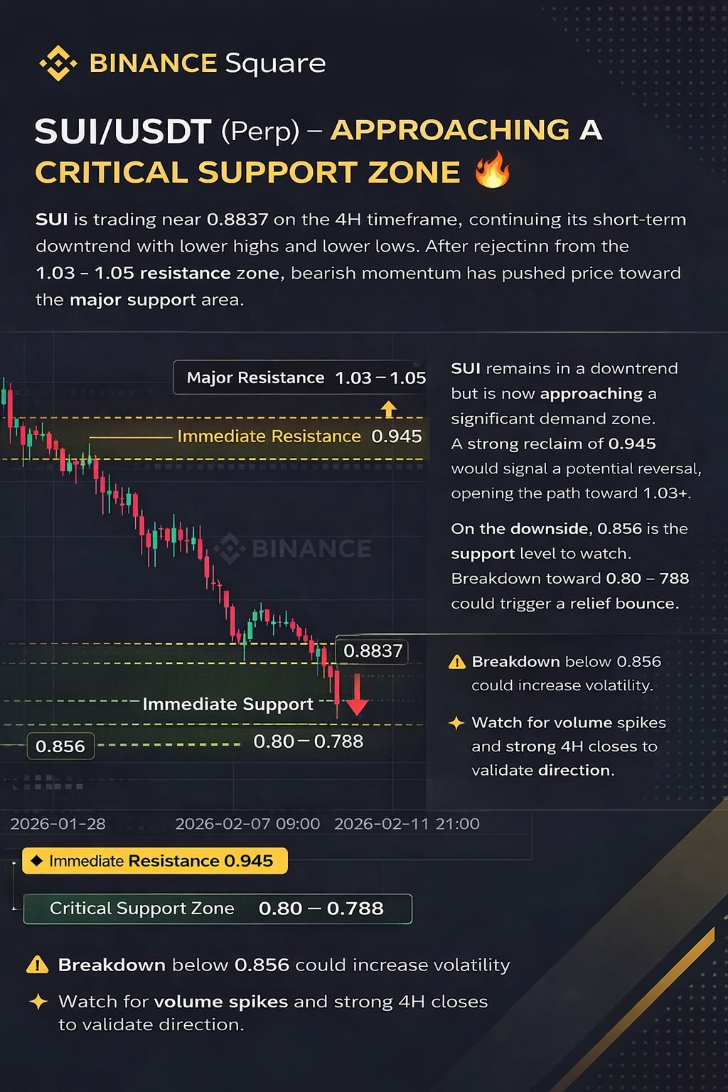 Если SUI упадет ниже 0.856, следующая цель по ликвидности будет находиться около 0.80 / 0.788, где может образоваться потенциальный отскок. Однако восстановление 0.945 будет первым бычьим сигналом, открывающим путь к 1.03+.