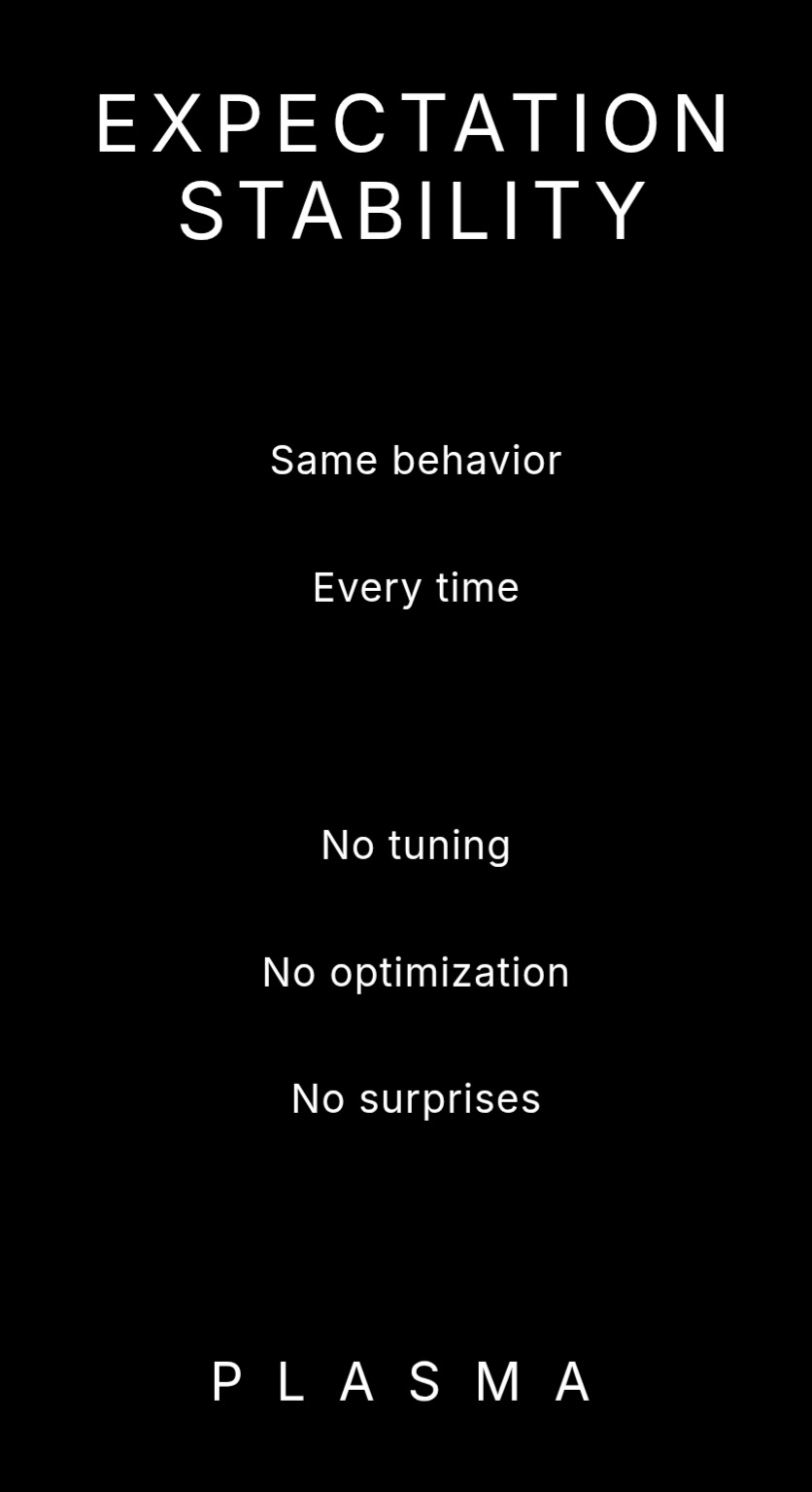 Плазма, похоже, признает это различие. Вместо того чтобы предлагать широкую свободу поведения на уровне транзакций, она ограничивает окружающую среду так, чтобы нормальное поведение было достаточным. Вам не нужно использовать опциональность. Вам не нужно овладевать механизмами. Ценность системы заключается в том, как мало она изменяется.