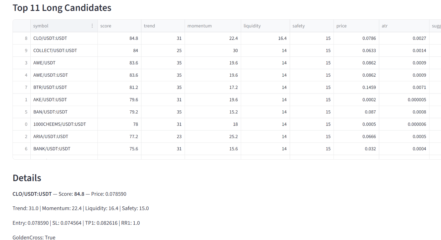 AWE0.0891+5.14%— Holding a clean 83.6. With a perfect 35/35 trend score, this is the definition of "clean movement".