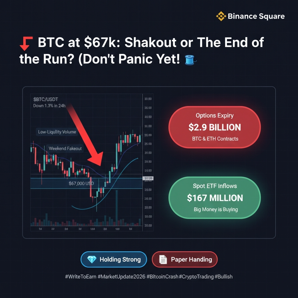 $BTC : We are currently battling for the $67,000 psychological support. Yes, we dropped 1.3% in 24 hours, but look at the volume—it’s a low-liquidity "weekend fakeout."