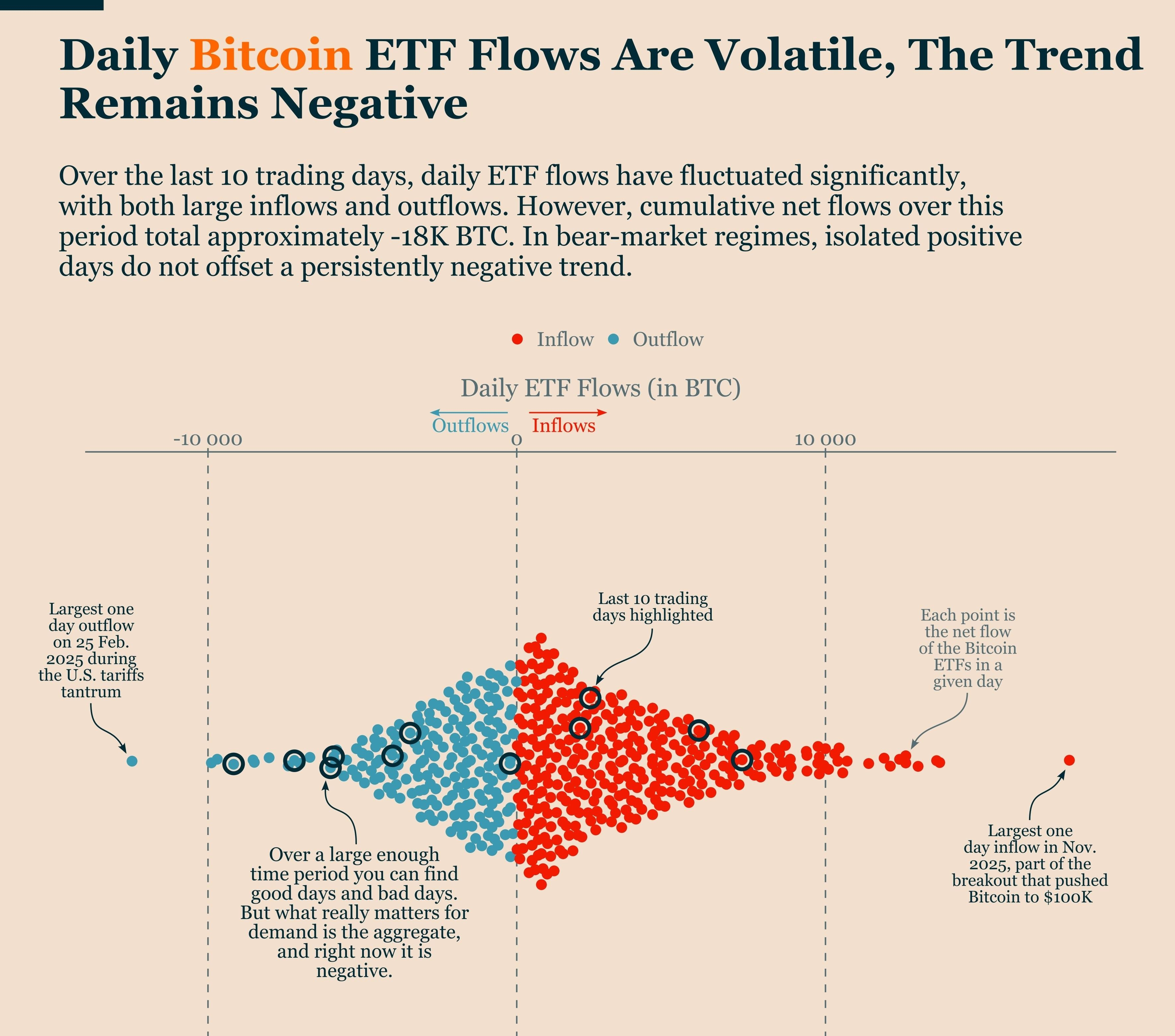 Возьмите потоки ETF в качестве примера. За последние 10 торговых дней мы наблюдали как крупные притоки, так и крупные оттоки. Некоторые дни выглядят отлично. Другие выглядят плохо. Если вы приблизите картину, вы можете убедить себя, что что-то меняется.
