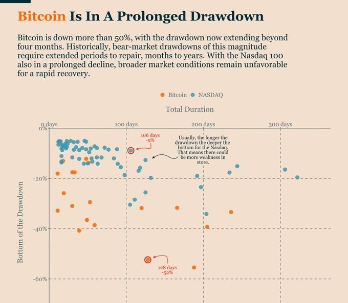 График ниже отображает исторические падения по продолжительности и глубине как для Биткойна, так и для Nasdaq 100. И есть явный паттерн: чем дольше длится падение, тем глубже коррекция.