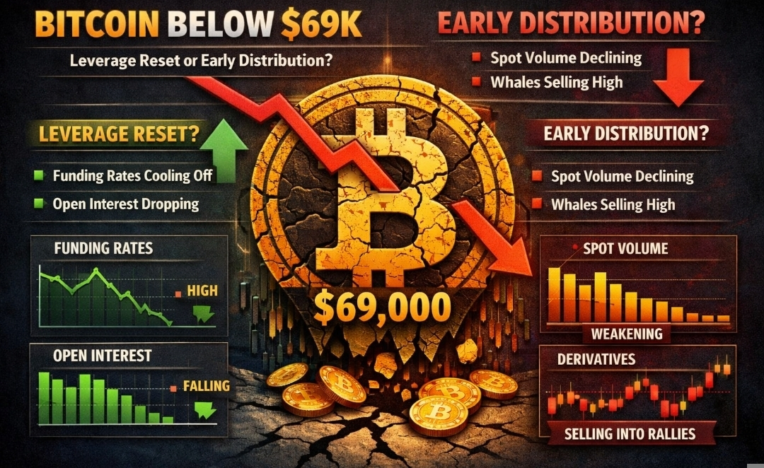 Я не ожидал увидеть $69K так быстро снова. Не потому, что Биткойн не может упасть. Он всегда может. Но потому что настроение всего две недели назад казалось почти недосягаемым. Ленты были полны графиков «новые максимумы на подходе», кредитное плечо тихо наращивалось, а ставки финансирования поднимались, и многие люди этого не замечали. Затем цена снова опускается ниже $69,000, и внезапно тот же временной отрезок звучит осторожно.