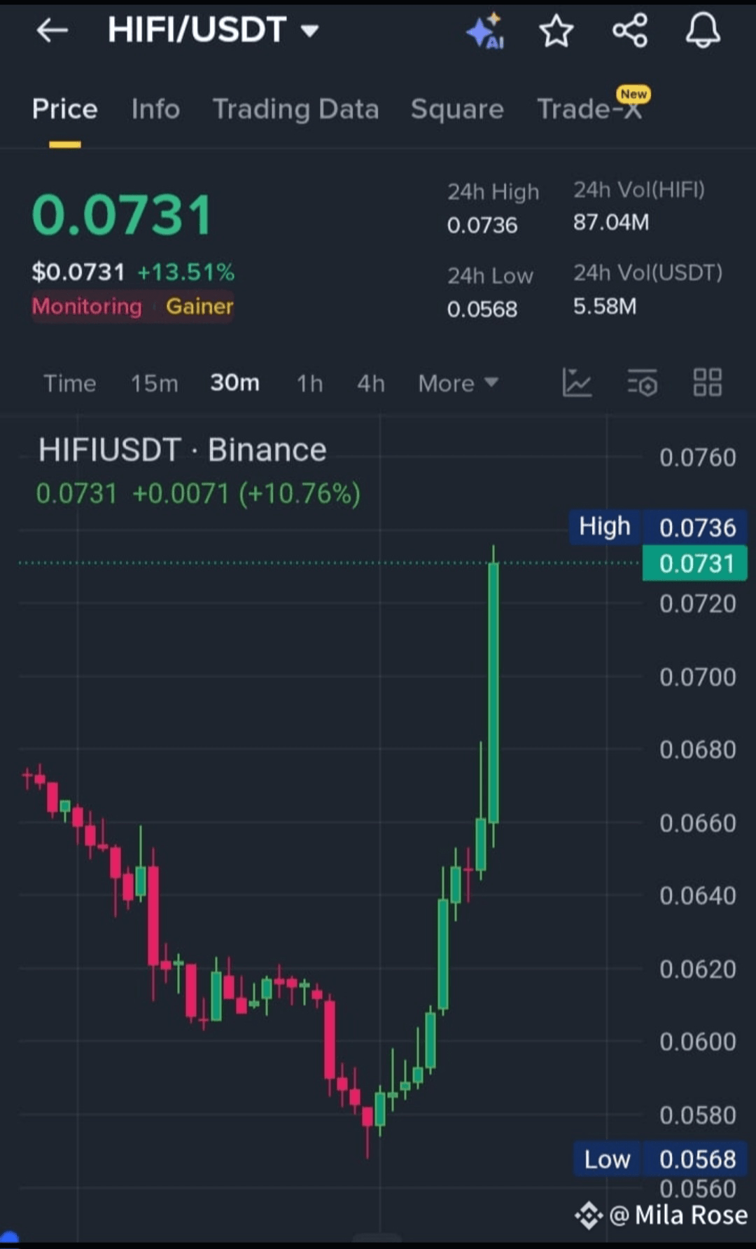 $HIFI показывает сильное восходящее движение, в настоящее время торгуется на уровне 0.0731 после резкого отскока от минимума 0.0568. Резкий рост как цены, так и объема торгов подчеркивает устойчивый интерес к покупке, хотя ожидается, что продавцы будут защищать сопротивление около 0.074.