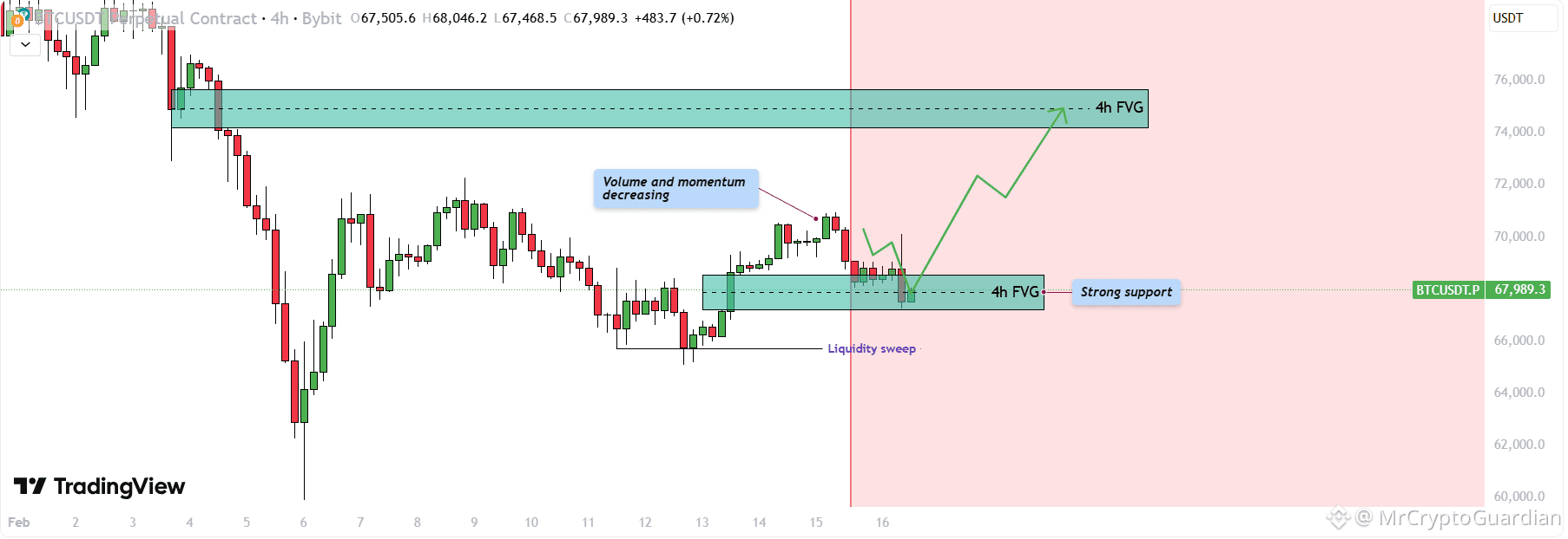 $BTC is currently Trading around $69k after recovering from a recent low. The market structure on the 4-hour Timeframe Shows a clear reaction from a liquidity event followed by a controlled move higher. however, price is approaching a decision point as momentum begins to slow. The interaction between the recent liquidity sweep, the 4-hr bullish FVG, and the higher resistance FVG will likely determine the next directional move.
