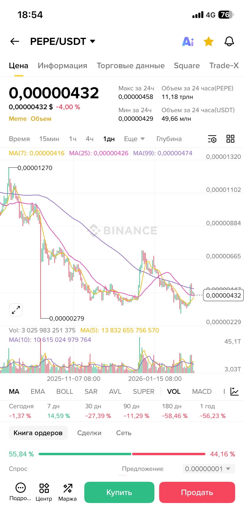 Пока мы держимся выше $0.00000426 (розовая линия), тренд локально бычий. Если биткоин не подведет, PEPE может легко дать +10-15% в ближайшие дни.