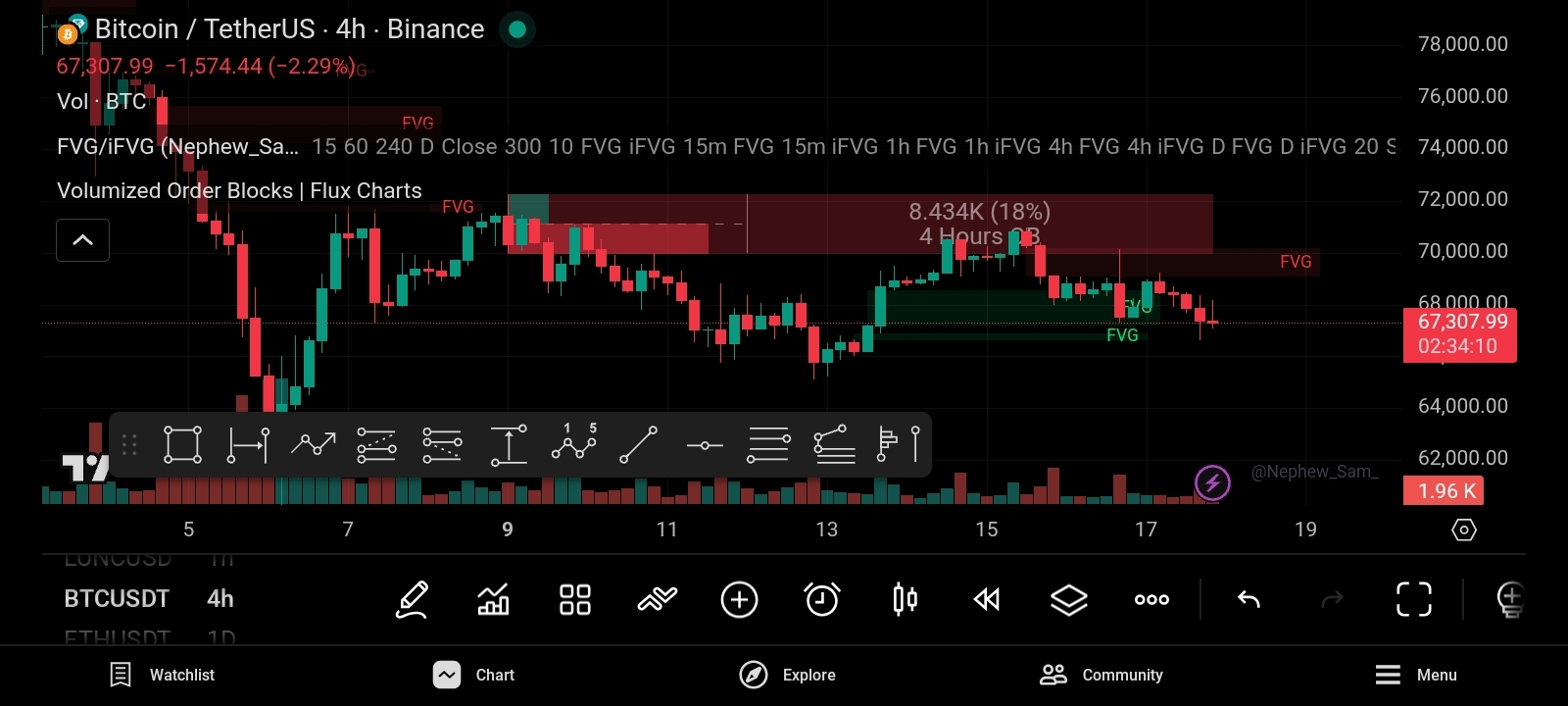 As of February 17, 2026, #bitcoin (BTC) continues to exhibit choppy price action on the 4H timeframe, reflecting broader crypto market trends amid economic uncertainties. With $BTC /USDT trading at approximately $67,308 (down 2.29% in the session), retail traders are eyeing key levels for potential entries. This analysis dives into the technical setup, incorporating Fair Value Gaps (FVG) and inefficiency zones (iFVG), while providing actionable trading strategies optimized for retail investors. Whether you're a beginner in crypto trading or an experienced trader on Binance, understanding these Bitcoin price patterns can help mitigate risks in this volatile cryptocurrency market.
