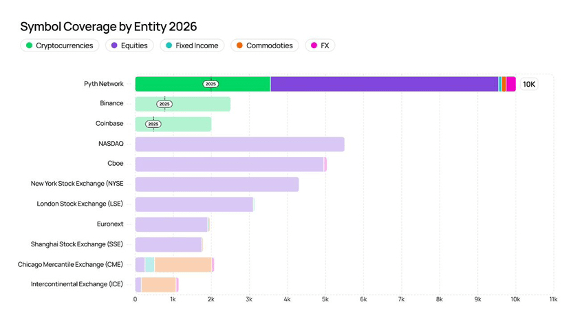 То, что началось как эксперимент в децентрализованных финансах, быстро становится крупнейшим единственным источником рыночных данных институционального уровня, существующим на сегодняшний день. Быстрый взгляд на покрытие символов показывает, что Pyth уже превосходит многие устаревшие биржи, с поставками по криптовалютам, акциям, валютному рынку, фиксированному доходу и сырьевым товарам, которые растут еженедельно.