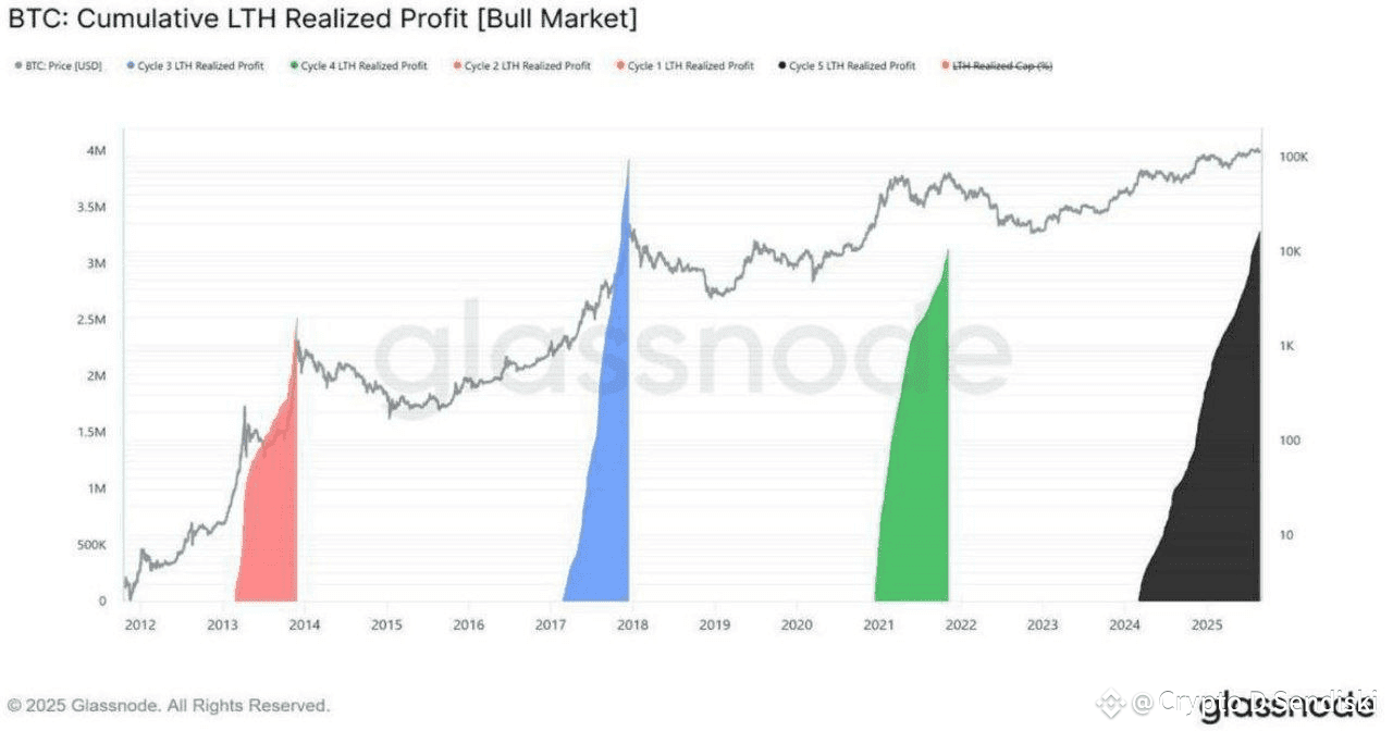 Les holders long terme ont déjà réalisé un profit de 3 400 000 BTC, pour environ 383 milliards de dollars, le volume le plus important comparé aux cycles haussiers précédents.