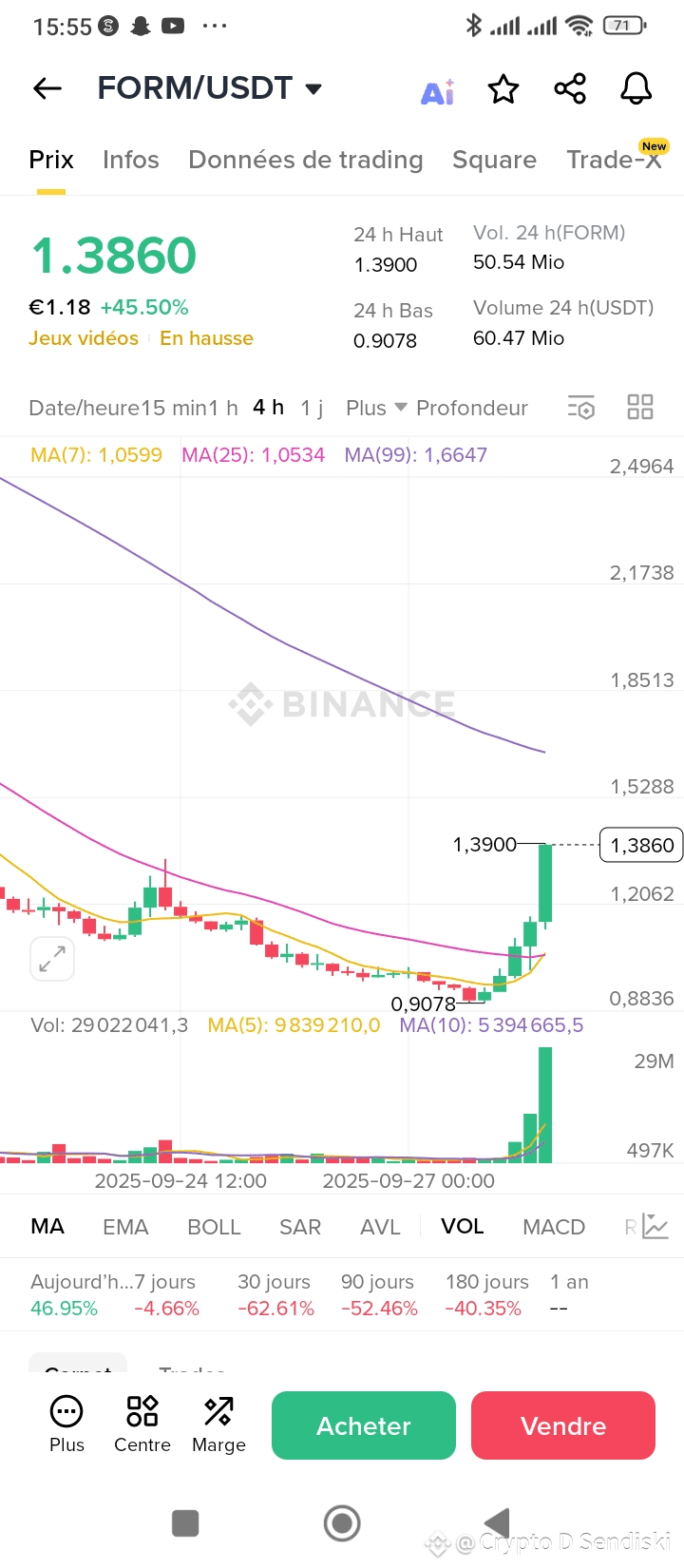 1. Rallye de prix : FORM a connu une forte hausse, augmentant d'environ 45 % en 24 heures, passant de 0,9159 à 1,3215, ce qui témoigne d'un fort momentum haussier.