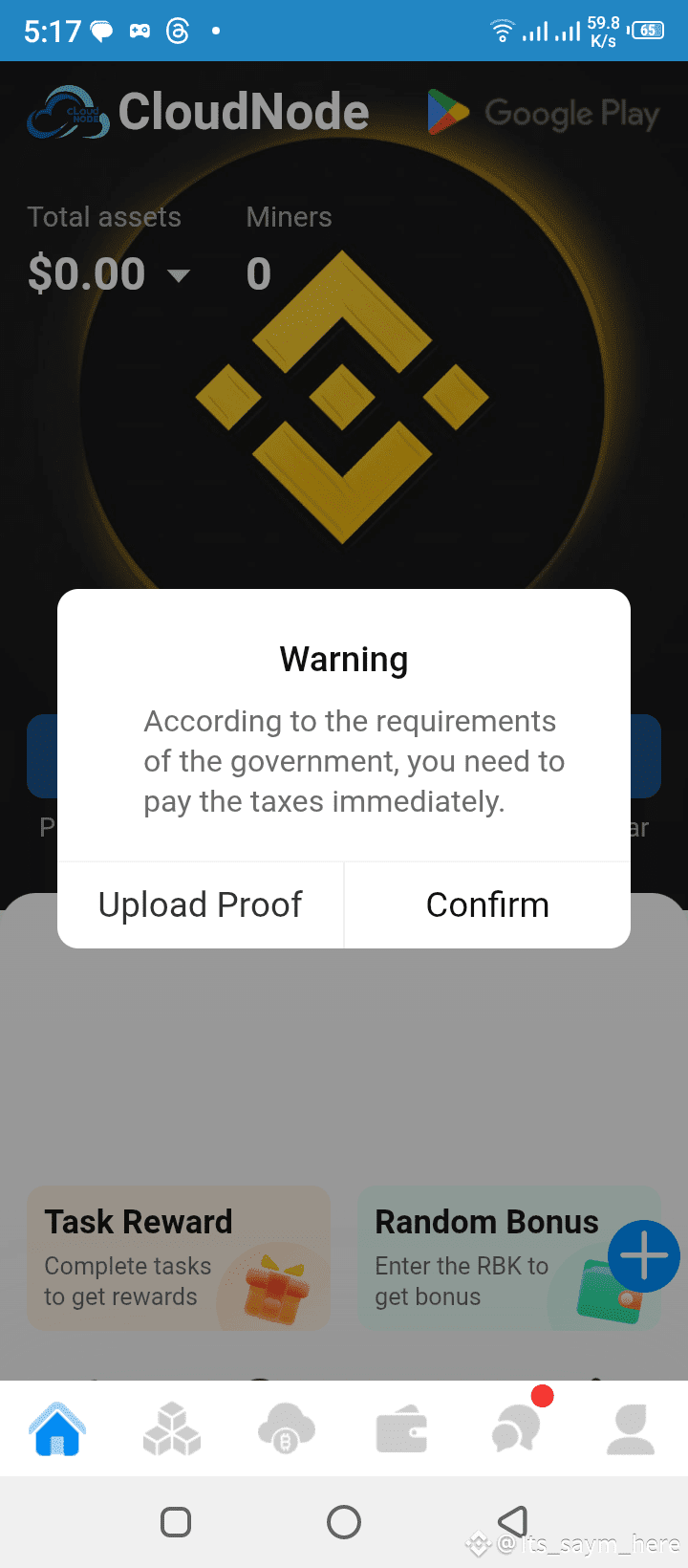 A company name Cloud node which were very famous from the last 6 month which was established since 2021.They claimed that they will give you profits from their mining machines on your investment.Because of few recommendations I started this with my last $10 savings and from the last few days they run a campaign about their crypto coin CDND binance listing where they give 100,50,20 and 10 Usd machines which can give you a 70x profits for a while week. I literally loan 20$ and buy their 10 Usd machines and I was thinking that I will withdraw it on very next day but they started a fake propaganda about Pakistani Government tax which can cost around 3.56 usd Because of 2 machines I have to pay 7$ I borrow It from my friend. According to admin at 5pm (PST) after tax payment withdrawals will be open and you can withdraw it.