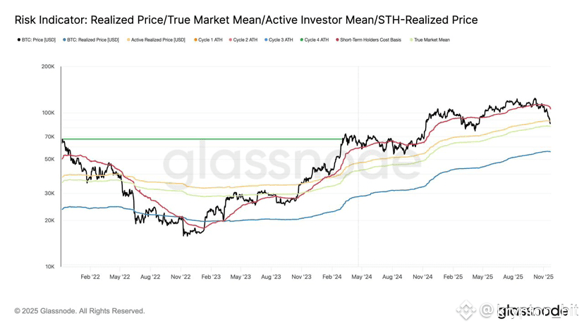 Позиции краткосрочных держателей сейчас находятся выше рынка, тогда как истинная средняя стоимость и реализованная цена остаются значительно ниже. Это означает, что краткосрочные участники рынка испытывают давление убытка, но долгосрочные остаются в плюсе. Исторически это состояние рынка часто наблюдалось перед устойчивым восстановлением.