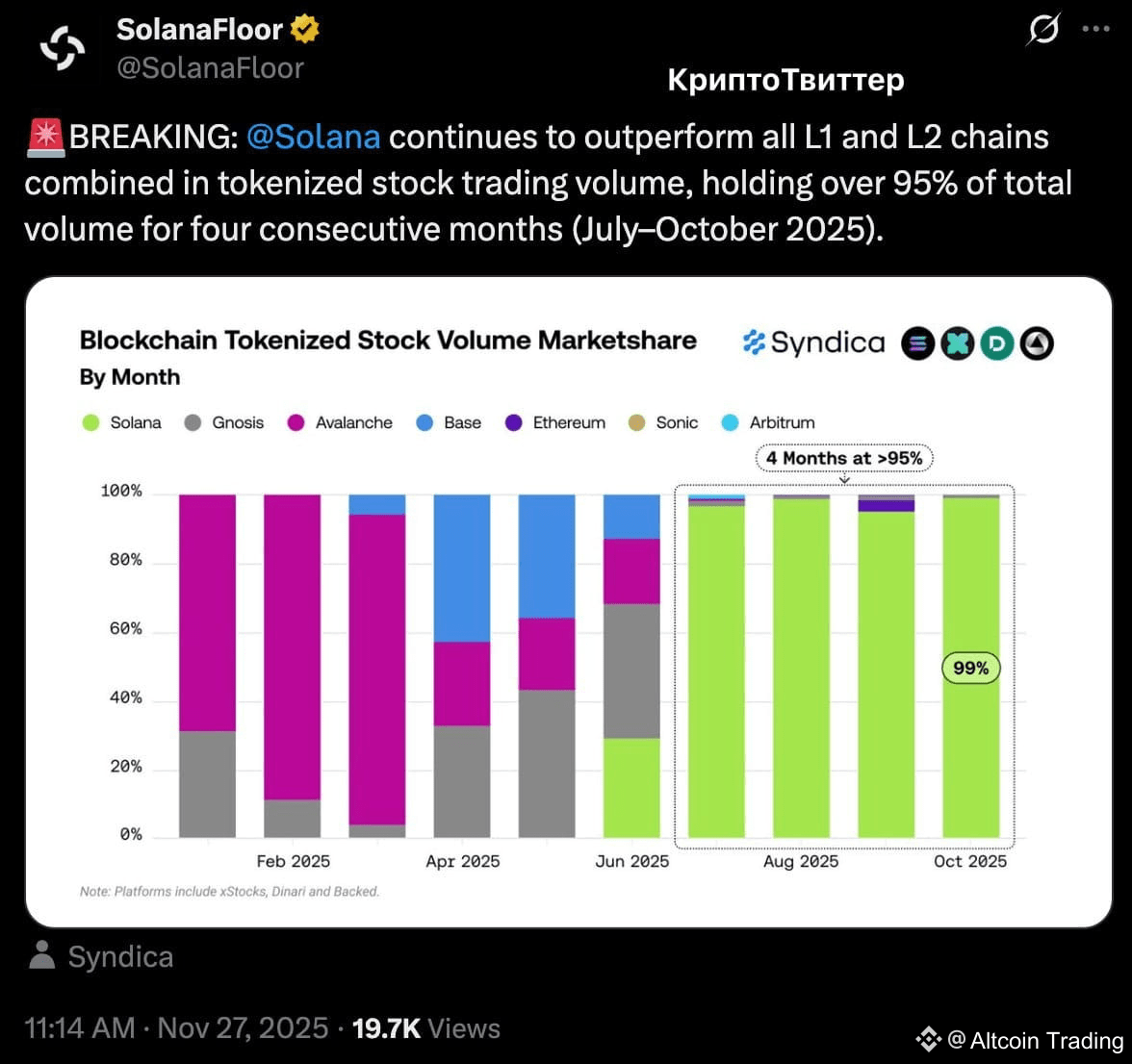 Рынок токенизированных акций в значительной степени смещается в экосистему $SOL , которая фактически превратилась в основной инфраструктурный слой для этого сегмента. На протяжении последних четырёх месяцев доля Solana в совокупном объеме торгов токенизированными акциями стабильно превышает 95 %, что свидетельствует не о разовой аномалии, а о сформировавшемся устойчивом тренде. Такой уровень концентрации активности говорит о том, что участники рынка воспринимают Solana как базовую площадку для экспериментирования на стыке традиционных финансов и ончейн-активов.