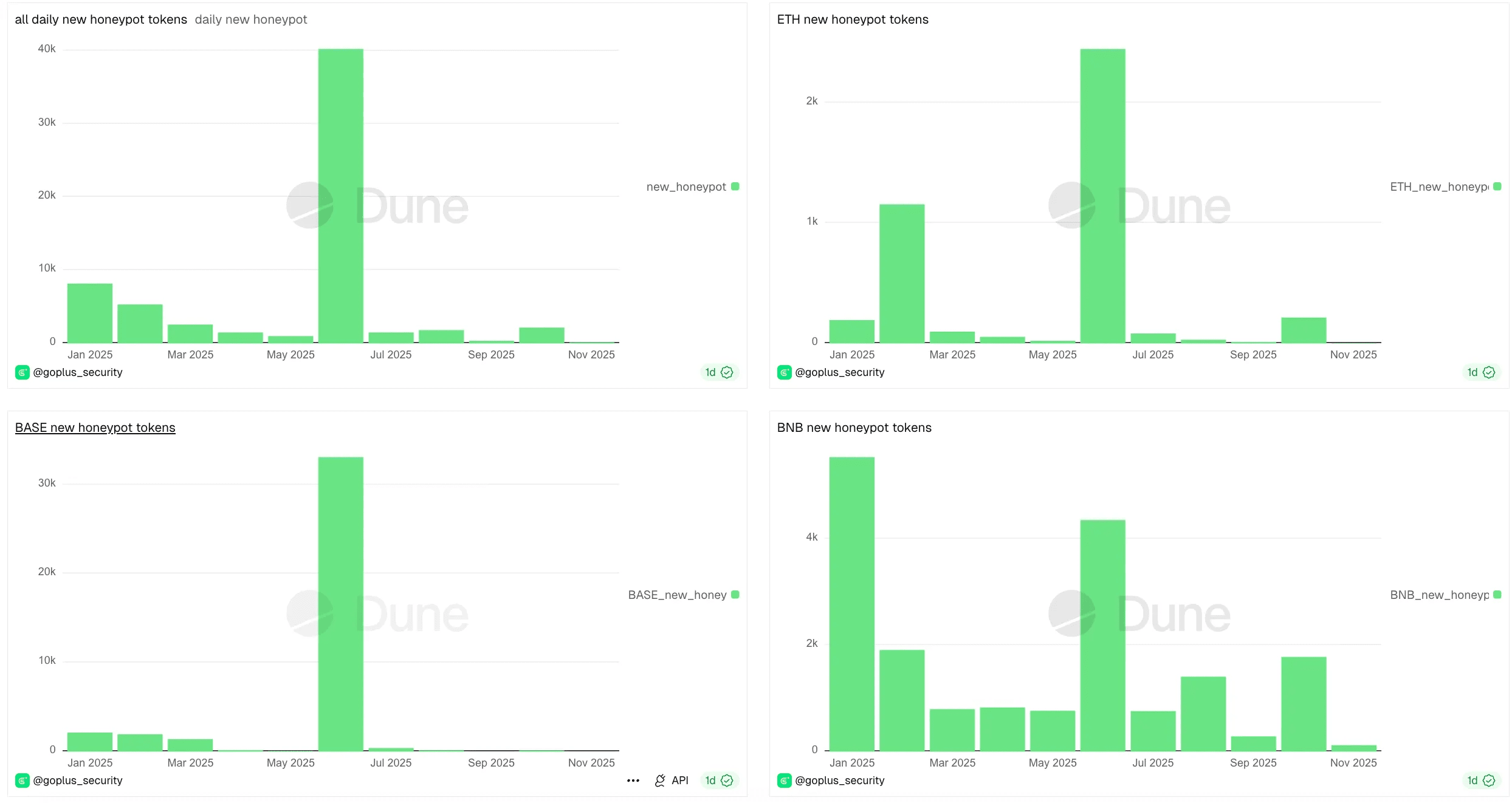В ноябре на ETH, Base, BSC было обнаружено 836 новых токенов пийся (HoneyPot), что меньше по сравнению с октябрём, среди них: