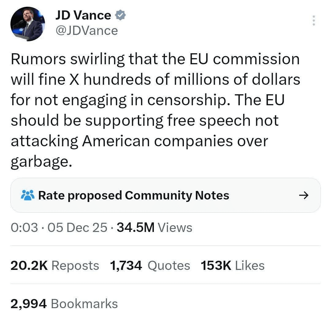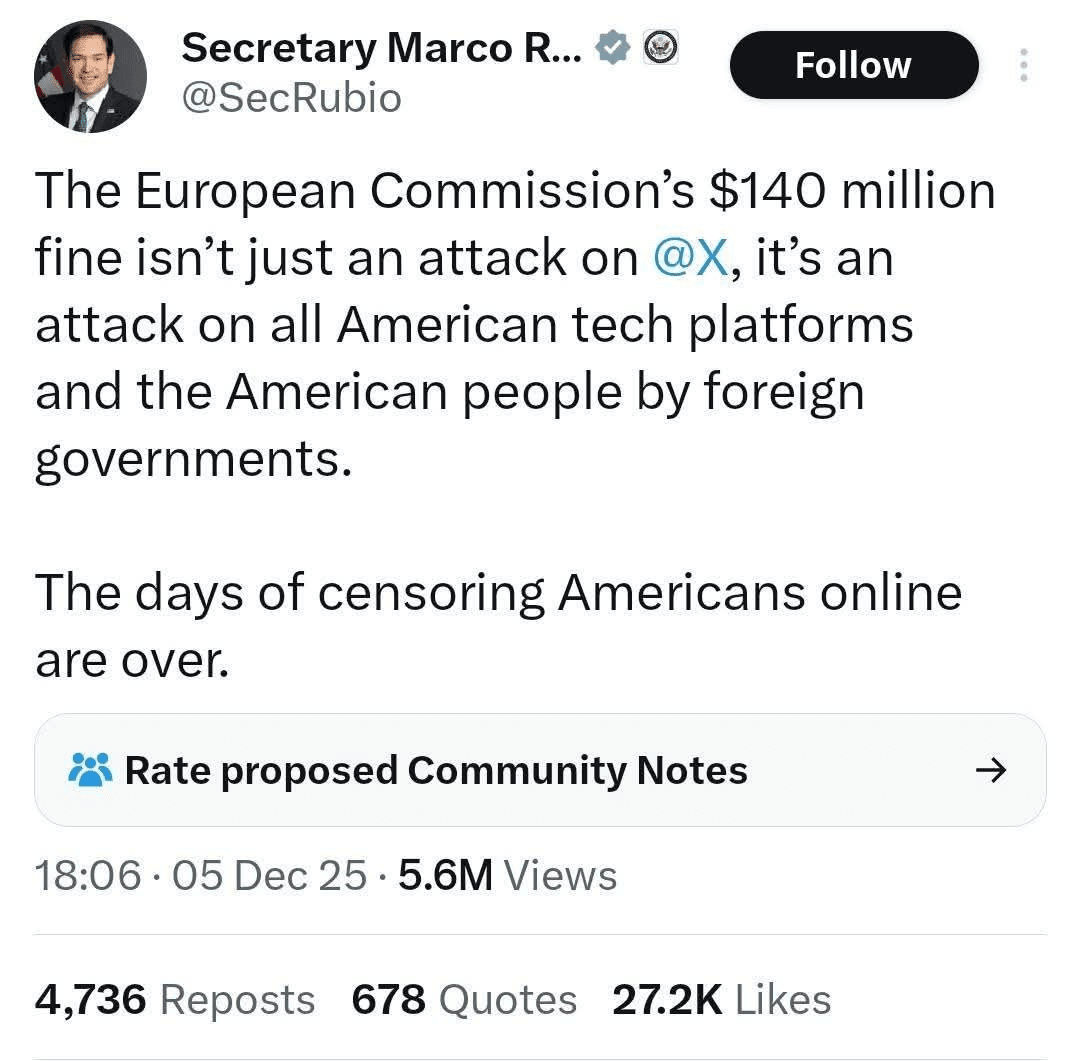 •Реакция США: Американские политики, такие как Марко Рубио и Джей Ди Ванс, охарактеризовали штраф как «атаку на Америку».