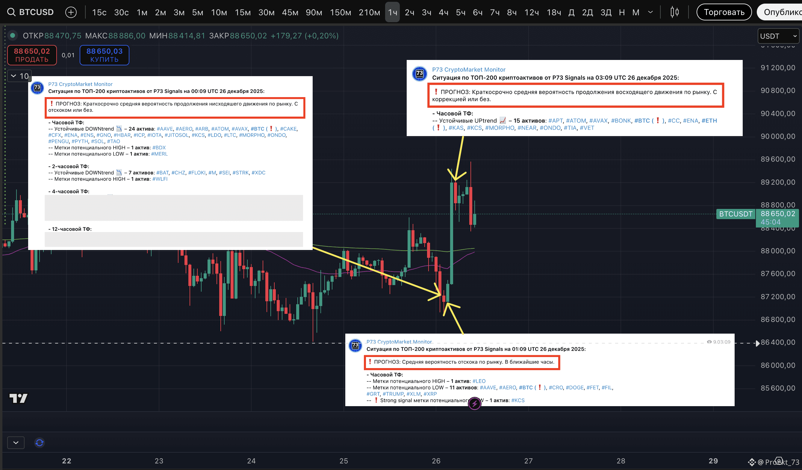 В чатеночью писали, что на месте медведей не стоит сильно обольщаться и "максимум пятница и суббота - их время". Но наказание шортистам было даже слишком быстрым (при этом P73 CryptoMarket Monitor дал сигнал вероятности отскока ровно на старте бычьего импульса).