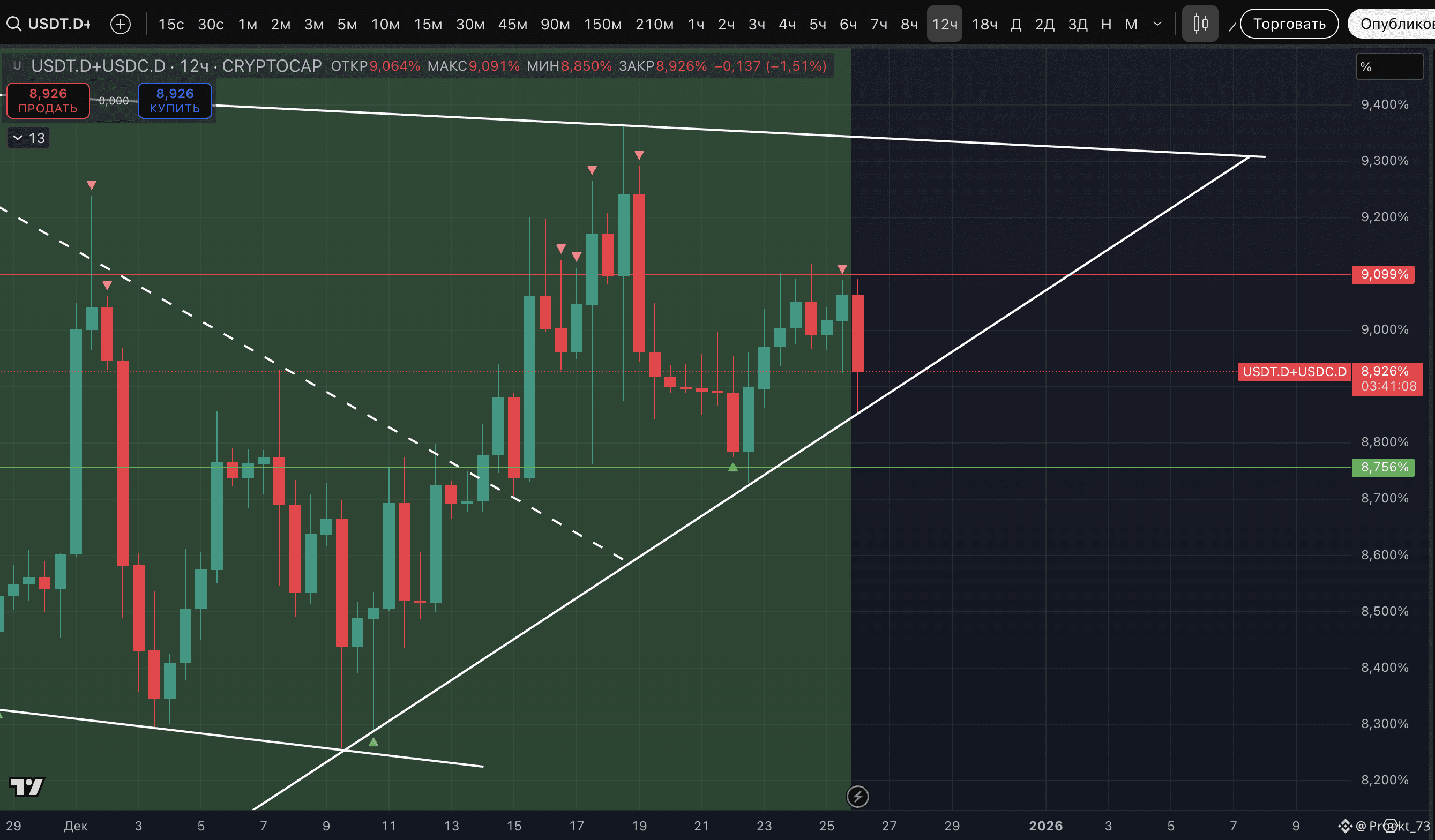 Ключевое в этом распиле - что на графике доминации стейблкоинов USDT+USDC на прошлой 12-часовой свече закрепилась метка потенциального хая. И на текущей свече уже стартовала отработка этой метки. Как видно по скрину, за последний месяц метки нашего индикатора отрабатывают развороты четко. А еще по скрину видно, насколько четкими поддержками/сопротивлениями выступают в последнее время горизонтальные уровни 8,756% и 9,099%. Соответственно, для быков крипторынка ОЧЕНЬ важно, чтобы доминация не начала уходить выше 9,099% и начала закрепляться ниже 8,756%.
