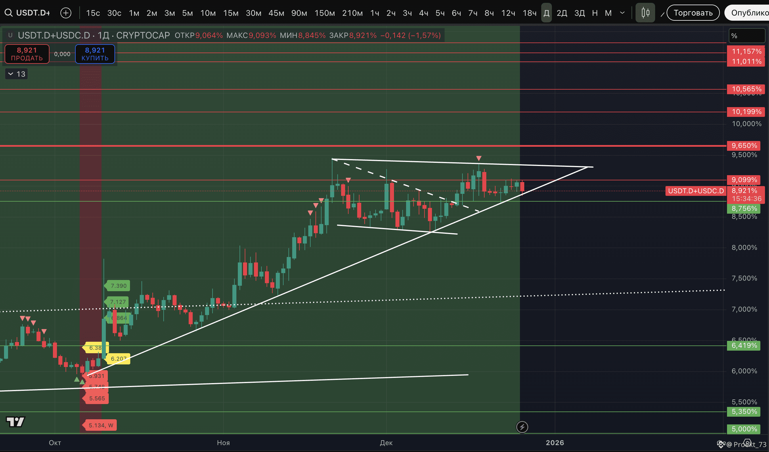 Как видно по доминации стейблкоинов, сейчас метрика пришла к ключевой трендовой поддержке - это поддержка с 7 октября. Дня после дня ATH #BTC. Если будет пробой вниз - то потенциально это старт отработки "Треугольника" с полной целью на горизонтальном уровне 5,350%. А в процессе если (а в нашем ожидании - когда) будет пробит район 8,27% - то это еще и формирование и старт отработки "Двойной вершины" с целью в районе 7,1%.