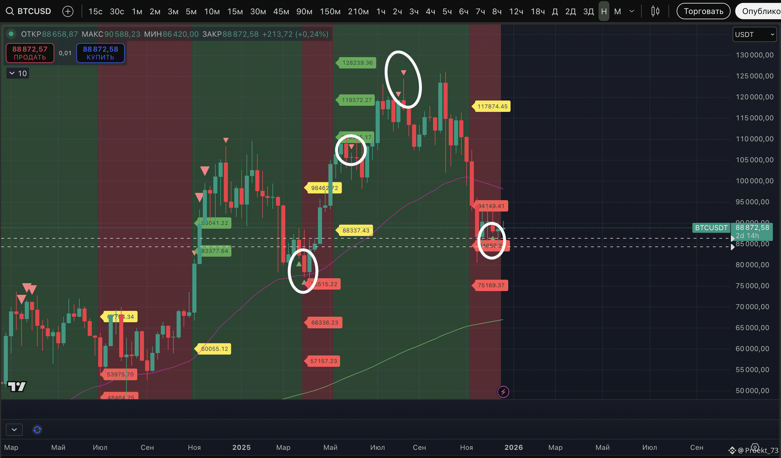 В конце апреля 2025 была метка потенциального лоя на недельном ТФ и это был сигнал на покупку. В августе были мощные сигналы на продажу - Strong signal потенциального хая на недельном ТФ и тогда мы писали - как расти при таких сигналах дальше - непонятно. С тех пор и корректируемся. Но утянули цену гораздо ниже, чем ожидалось, это факт. Если тянуть фибо - на тест уровня 0.382.
