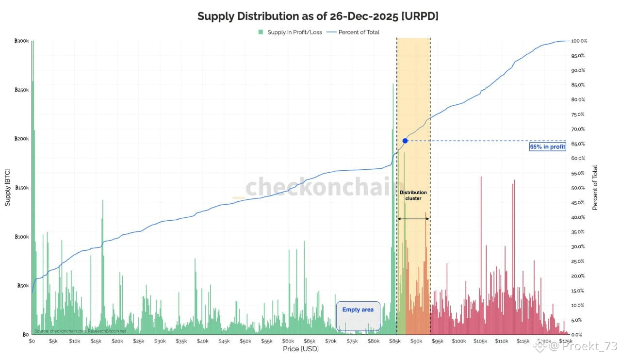 По данным аналитиков #Checkonchain, цена #BTC продолжает двигаться внутри кластера распределения 85 000-92 000$ - области, где рынок уже несколько недель перераспределяет предложение.
