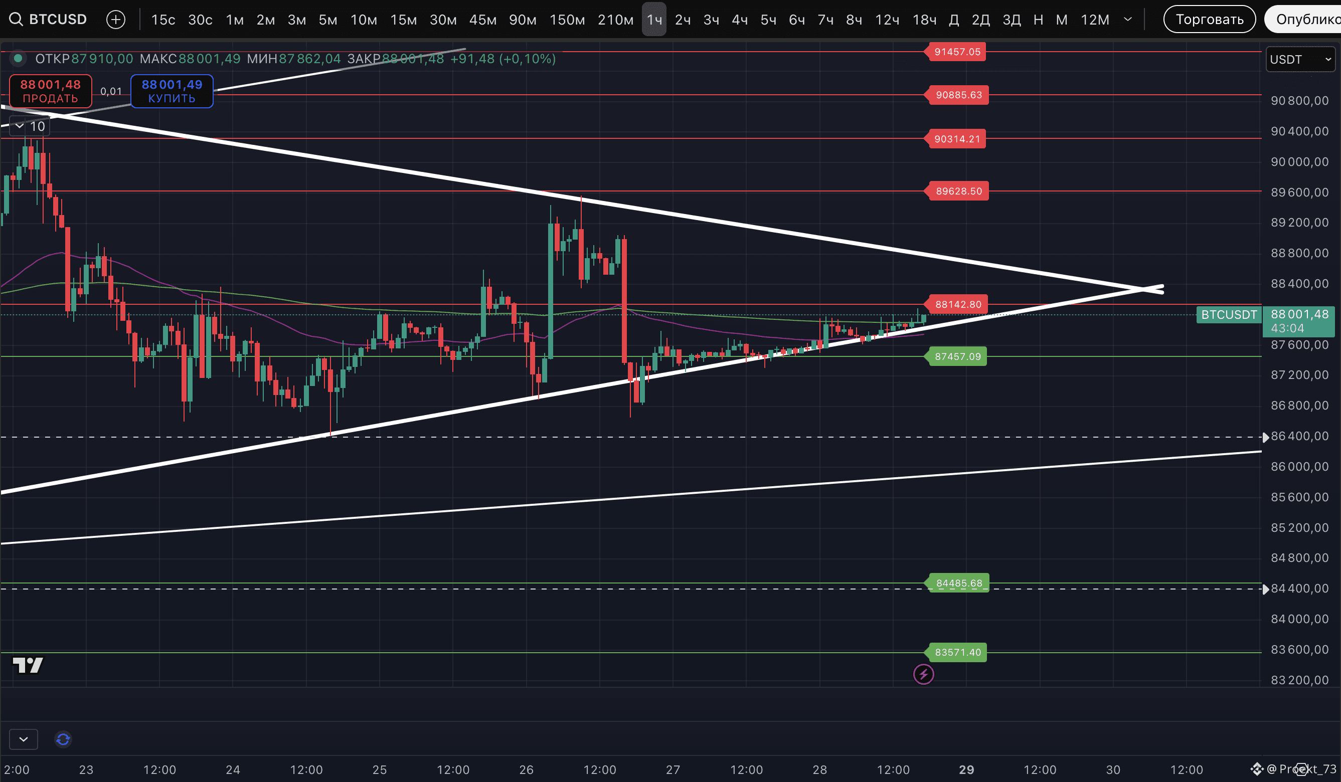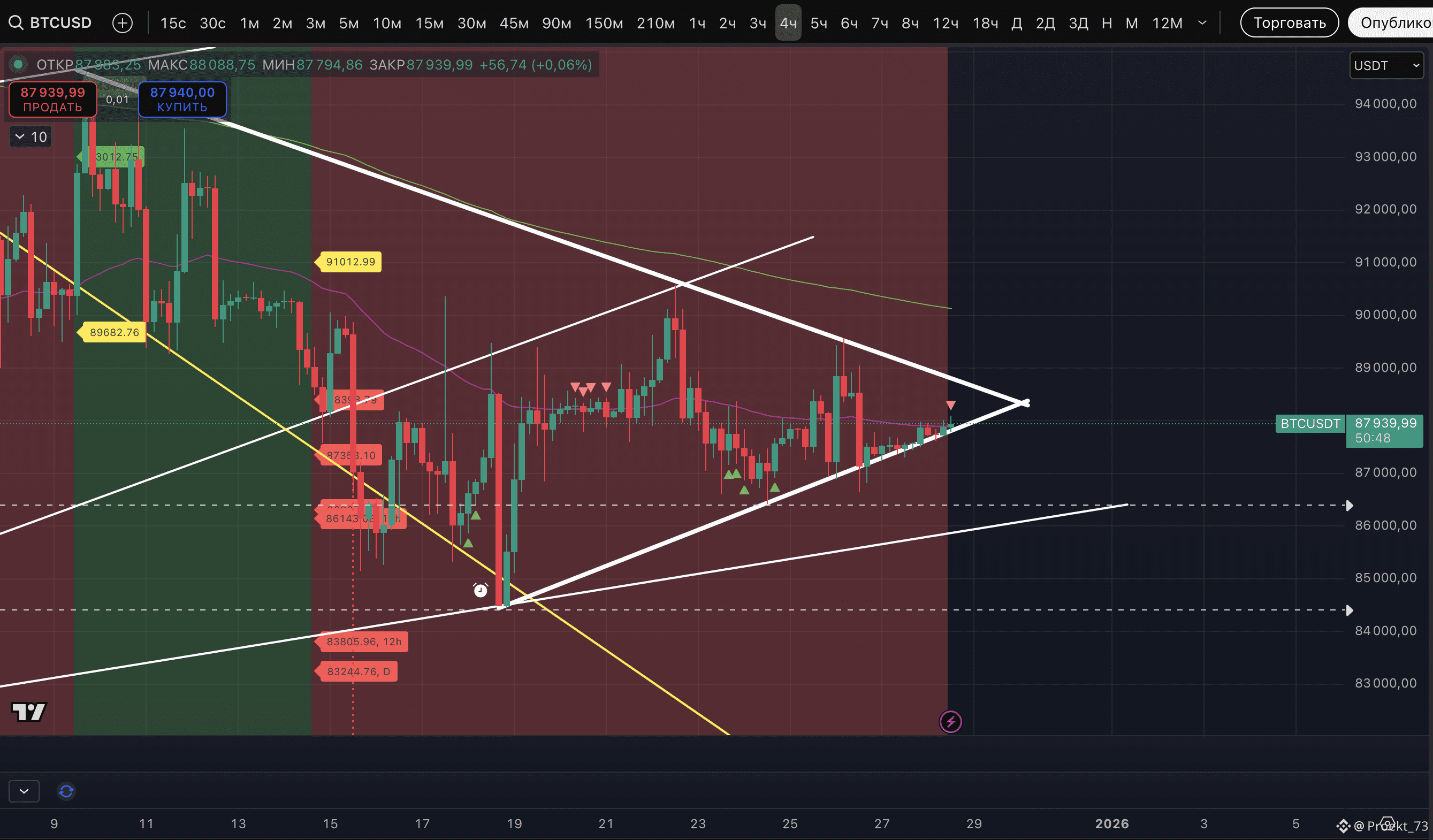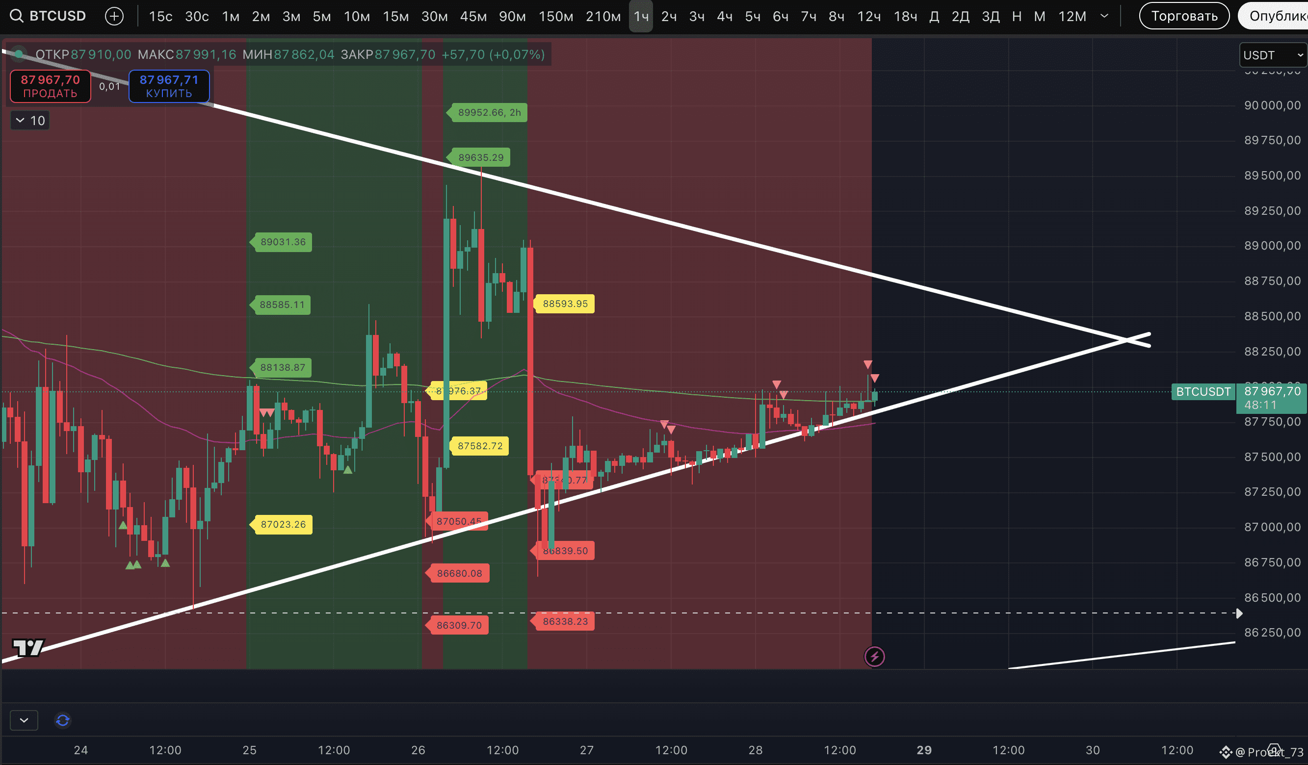 Ситуация неопределенная, подождем выхода из диапазона 87 457$ и 88 142$. Но пока склоняемся к ожиданию движения вниз.