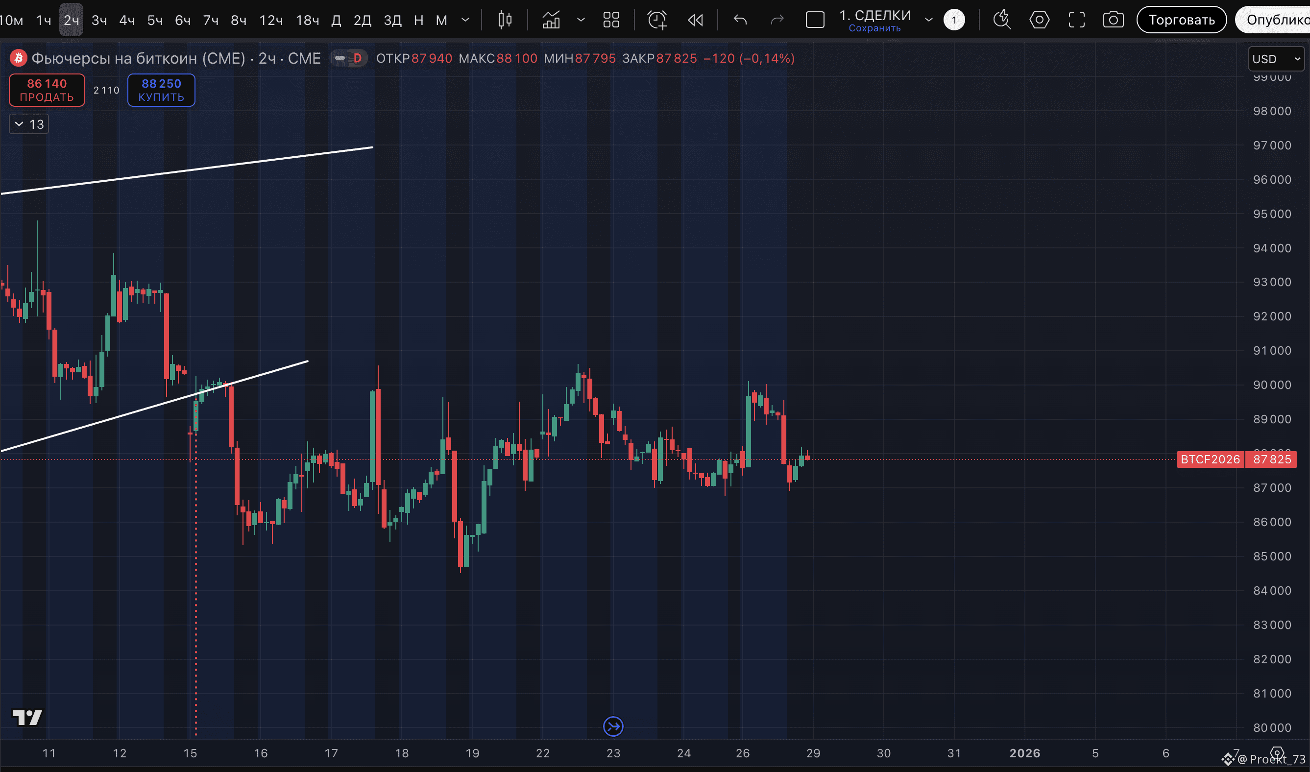 Торговля фьючерсами на BTC на Чикагской товарной бирже (CME) закончилась в пятницу на уровне 87 825$. Это цена-"магнит" к возобновлению торгов этой ночью.