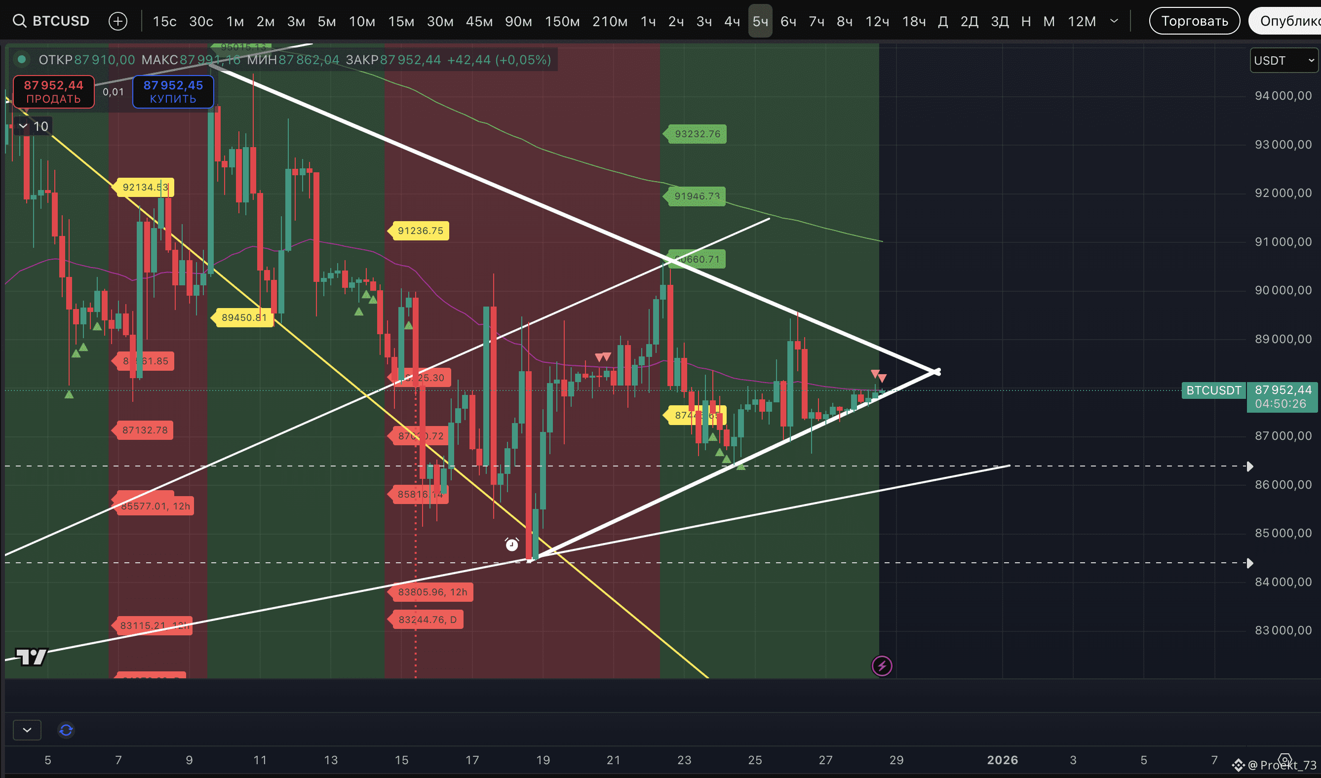 По горизонтальным уровням - цена движется в диапазоне между 87 457$ и 88 142$. И важно то, что пробой в любую из сторон выведет цену в зону импульсных движений. В случае роста - это зона 88 142-89 628$. В случае коррекции - это зона 84 485-87 457$.