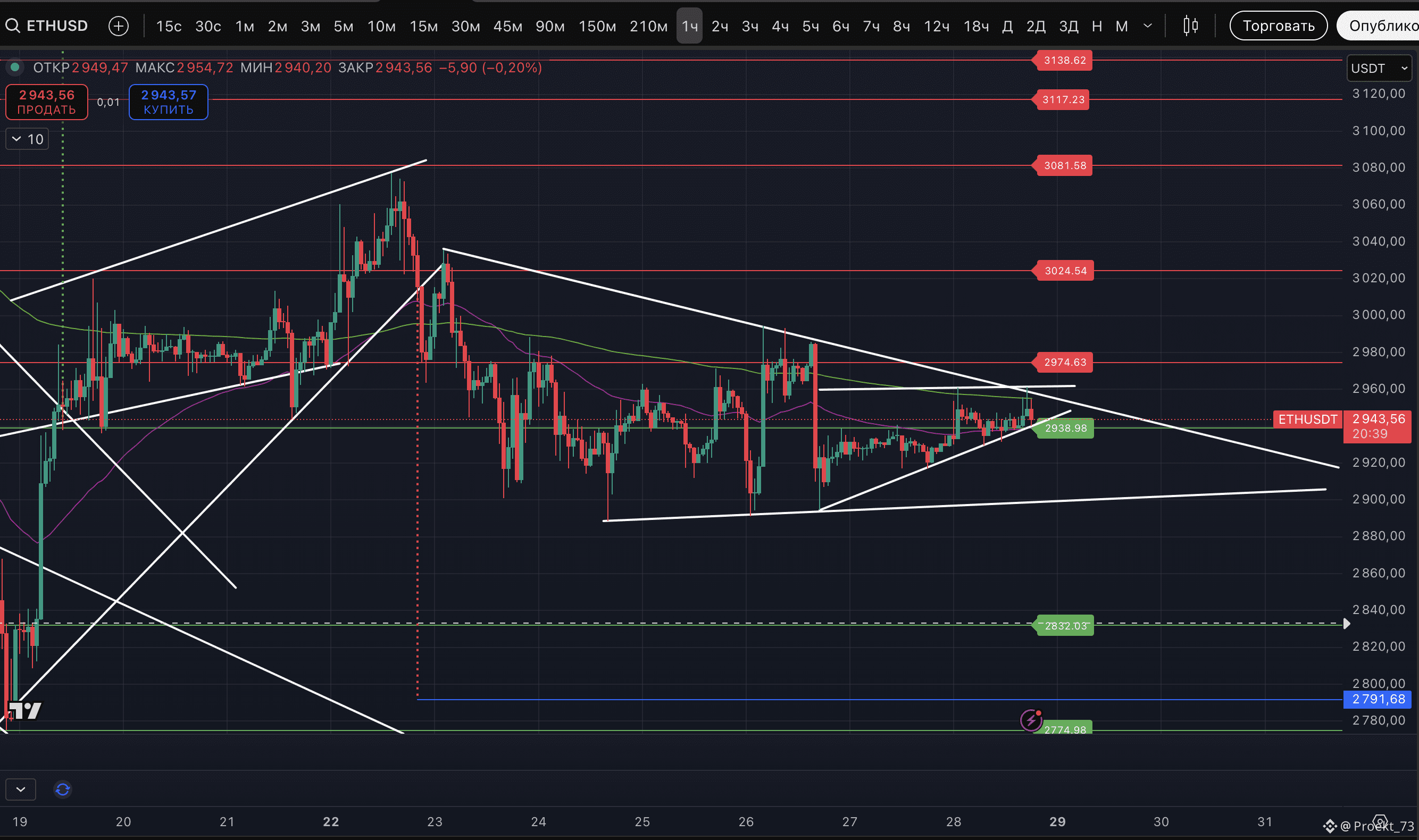 Здесь пока ближайшее ожидание - это отработка локального "Медвежьего клина" с полной целью 2 873$ и в рамках этого - тест нижней трендовой "Треугольника", поход в район 2 900$.
