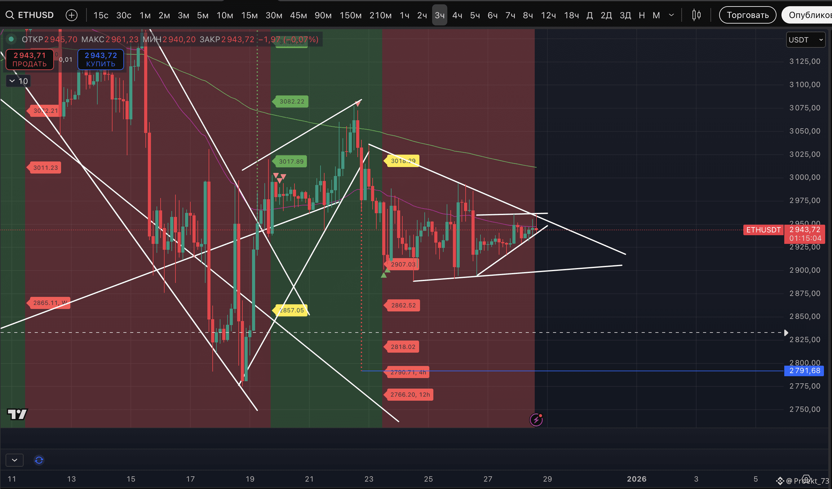 Ситуация по ETH в моменте смотрится также коррекционно. У его графика с пятничной коррекции цена отрастает "Медвежьим клином", а само движение цены с 23 декабря - также теперь формирует не выраженный бычий паттерн, а потенциальный "Треугольник".
