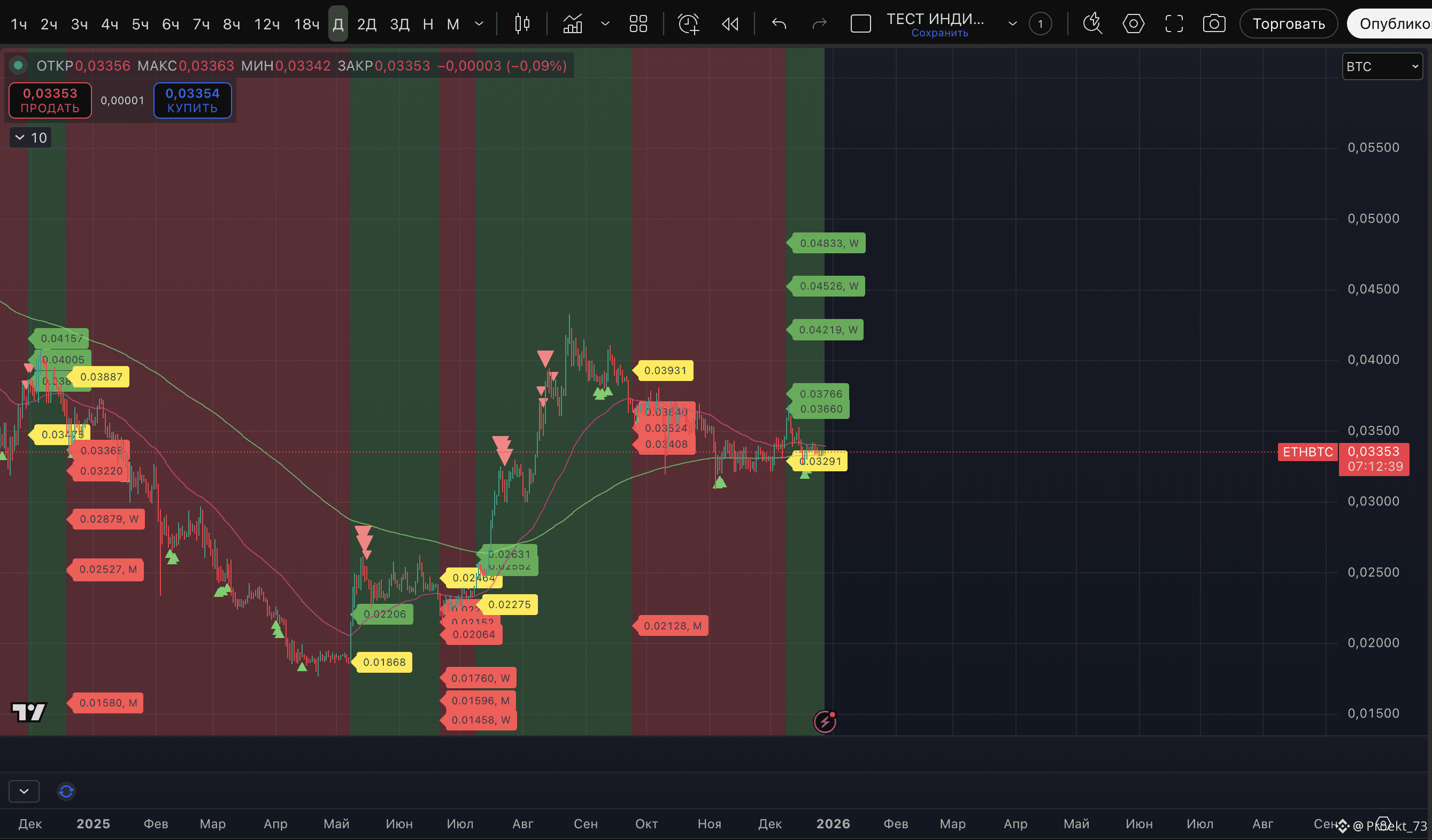 Кроме того, по нашему индикатору P73 Smart Liquidity Zones (показывает горизонтальные и уровни по свечным структурам) цена сейчас лежит над ключевой поддержке - 0,03284 BTC. В начале августа цена пробила этот уровень как сопротивление, в во второй половине августа поставила хай импульса и сейчас пришла к тесту этого уровня уже как поддержки. Пробой и ретест пробоя.