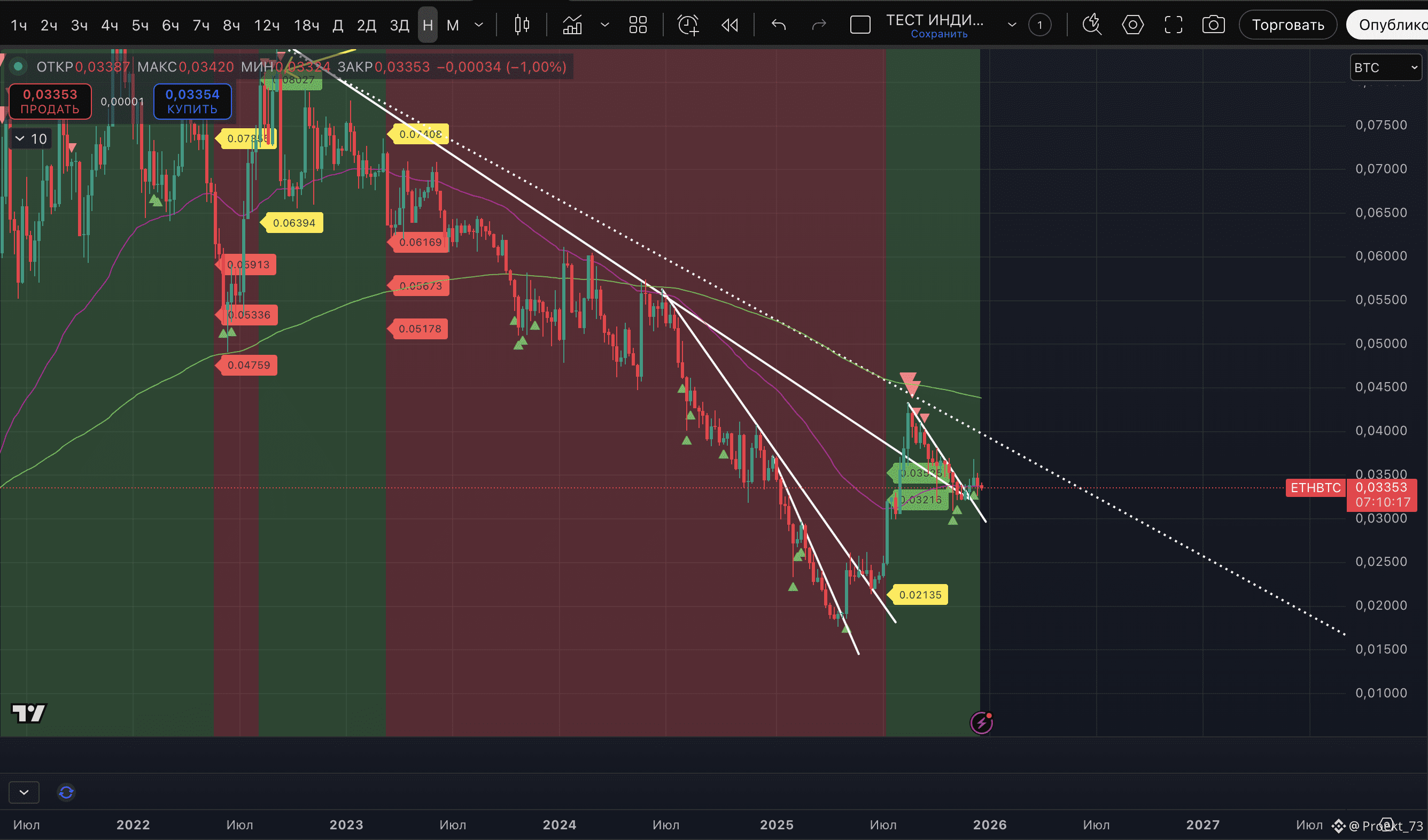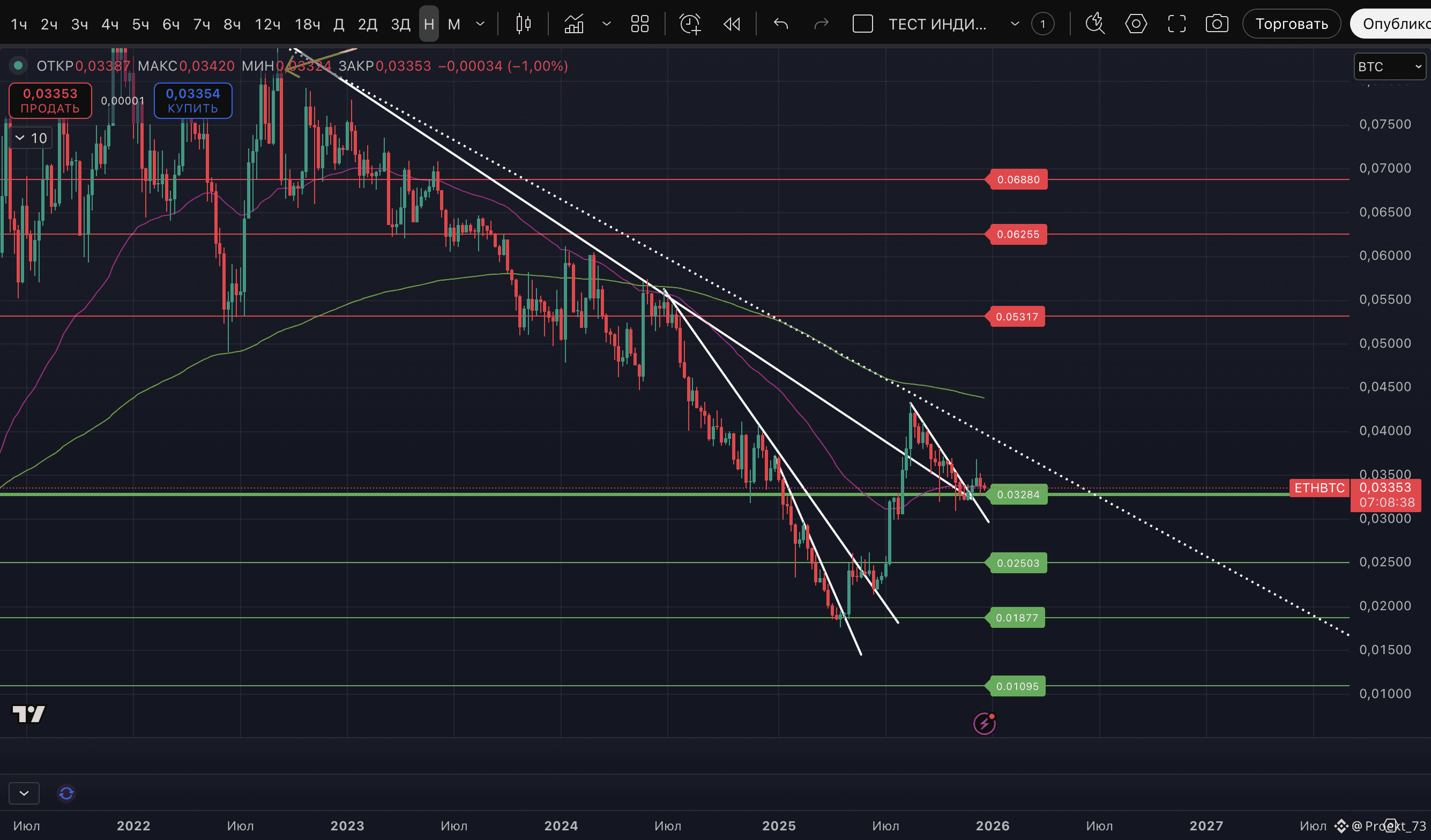 Что не вяжется с медвежьими ожиданиями - так это то, что на графике пары ETH/BTC цена на старших (дневном, недельном) ТФ сформировала базу для продолжения роста. Есть аптренд на дневном ТФ и метки лоя, есть тест EMA 200. Есть аптренд на недельном ТФ и есть четвертая добавочная метка потенциального лоя, которая подтверждает попытку возвращение графика к росту, от теста EMA 50 недельного ТФ.