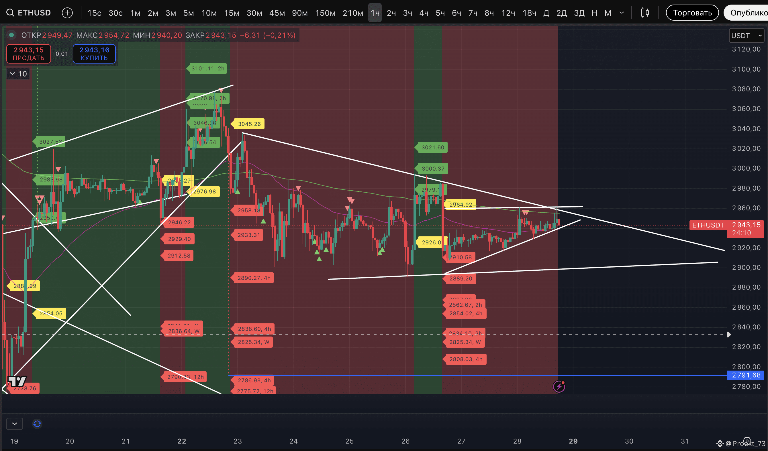 По меткам потенциального хая, правда, ситуация не настолько медвежья, как у BTC. У эфириума есть только метка потенциального хая на 5-часовом ТФ.