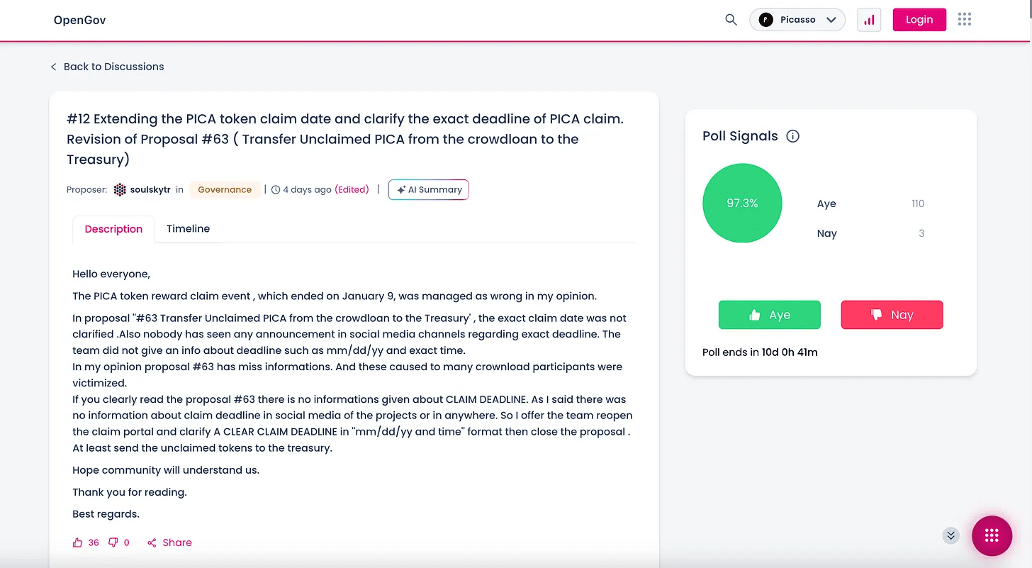 2. Неправильное управление токенами $PICA, на которые не претендуют участники краудлендинга, в основном связано с недостаточной передачей информации о сроке погашения, что приводит к недовольству среди вкладчиков. Сообщество форума Пикассо OpenGov настаивало на отмене решения о выделении этих токенов в казну, что является ключевым вопросом, влияющим на позицию проекта в отношении отношений с сообществом.