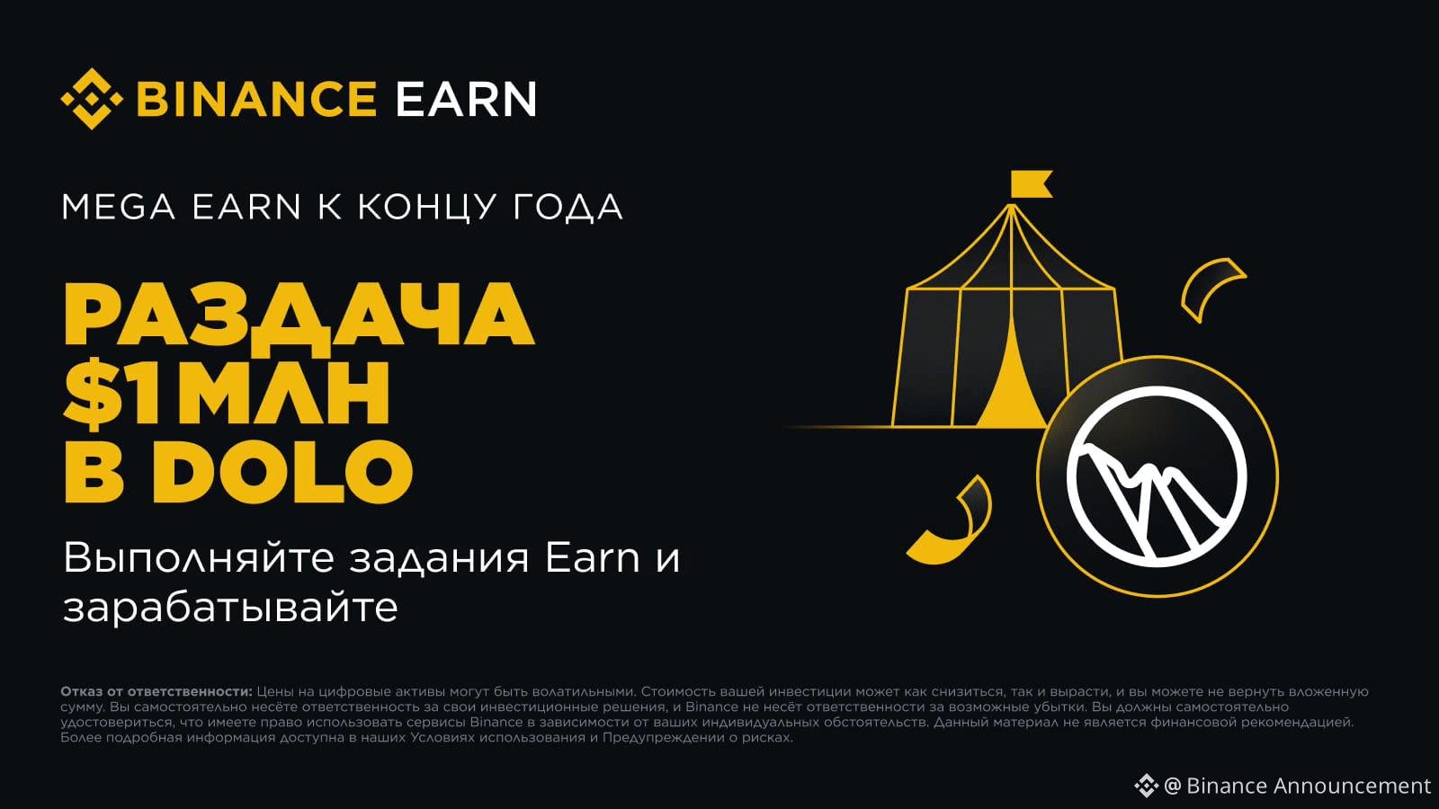 Binance Earn с радостью запускает Глобальную кампанию Mega Earn к концу 2025 года! Выполняйте задания, зарабатывайте баллы кампании, поднимайтесь в рейтинге и делите призовой фонд 1 000 000$ в DOLO. Право на получение наград открывает сразу несколько возможностей: