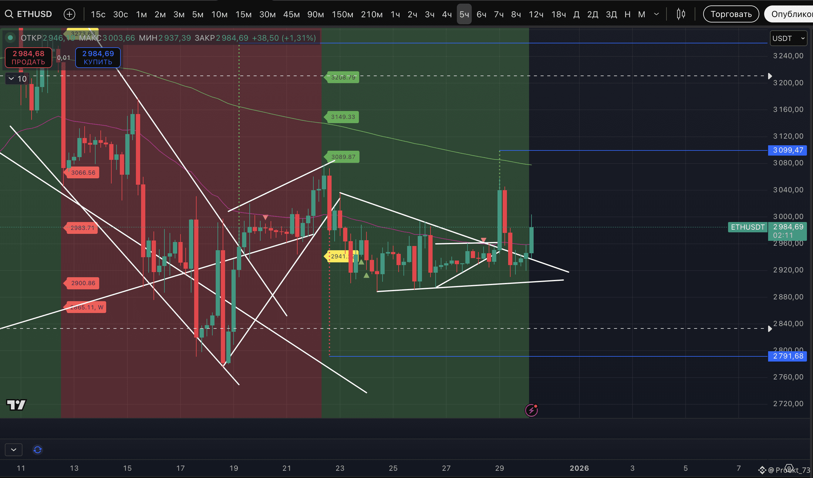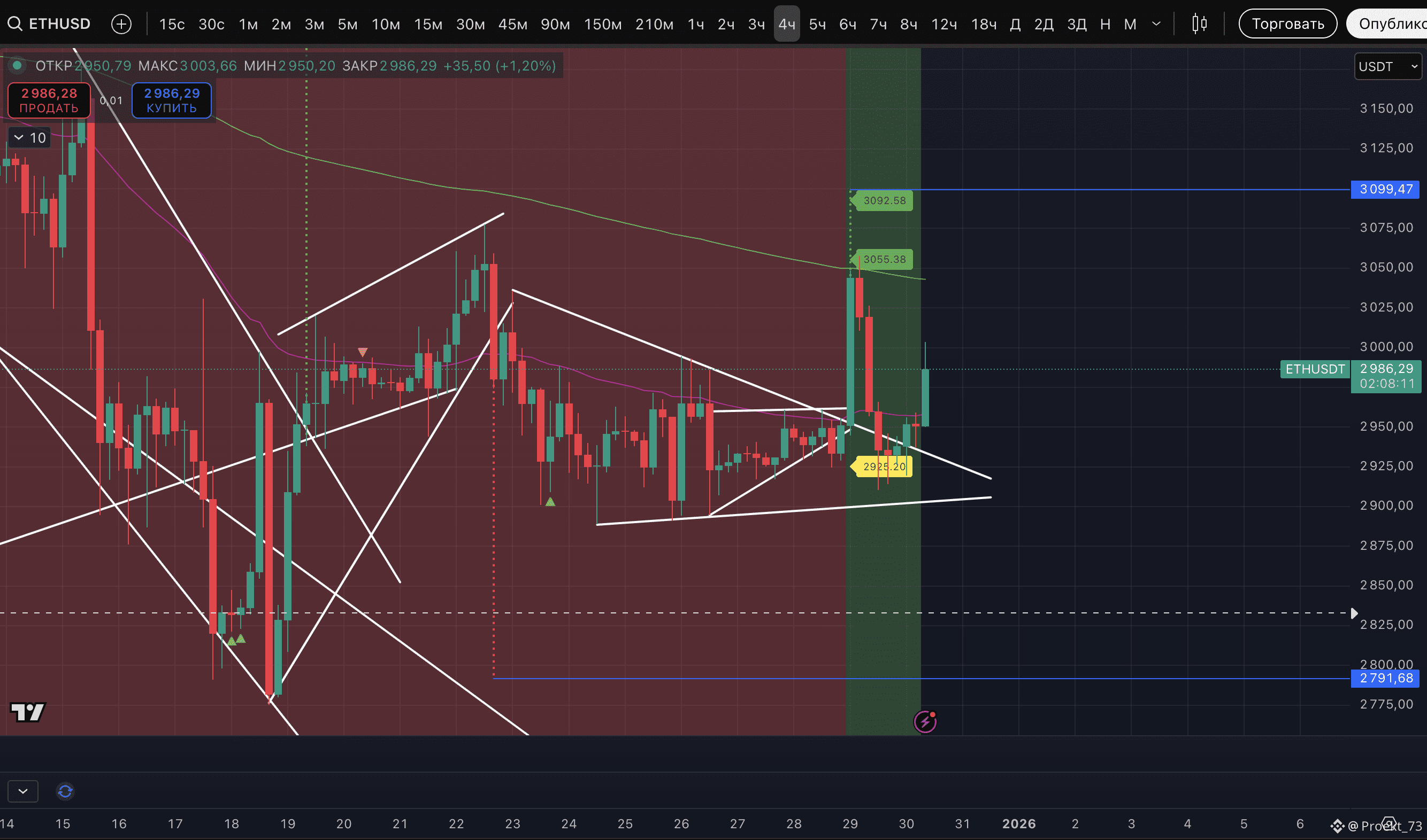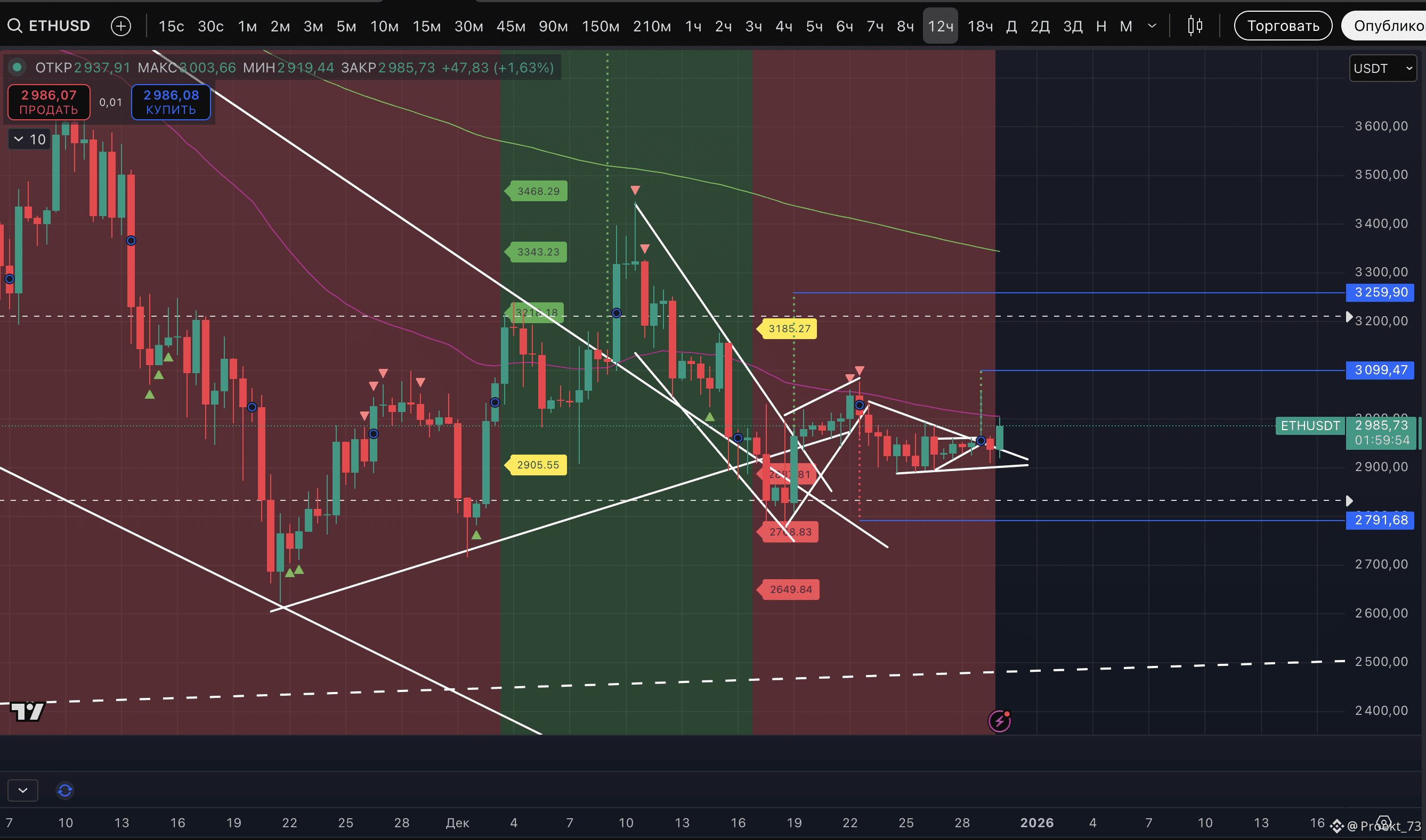 UPD по ETH на утро 30 декабря. За время коррекции вчера были удержаны уровни потенциального слома аптрендов на 3- и 4-часовом ТФ по нашему индикатору. Напомним, это 2 924$ и 2 925$ соответственно.
