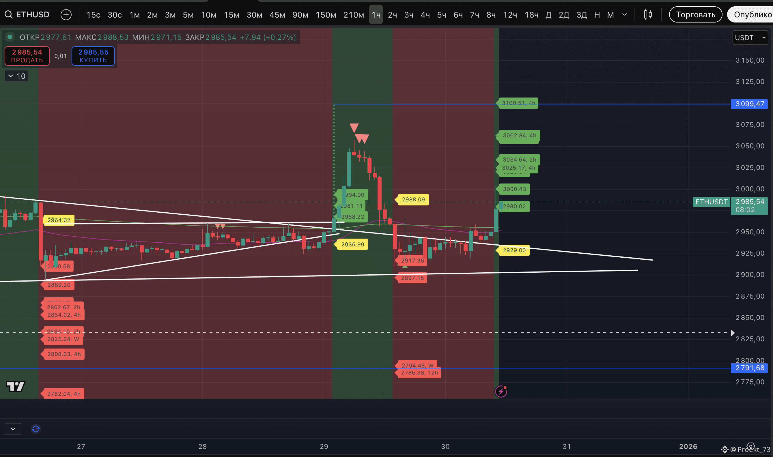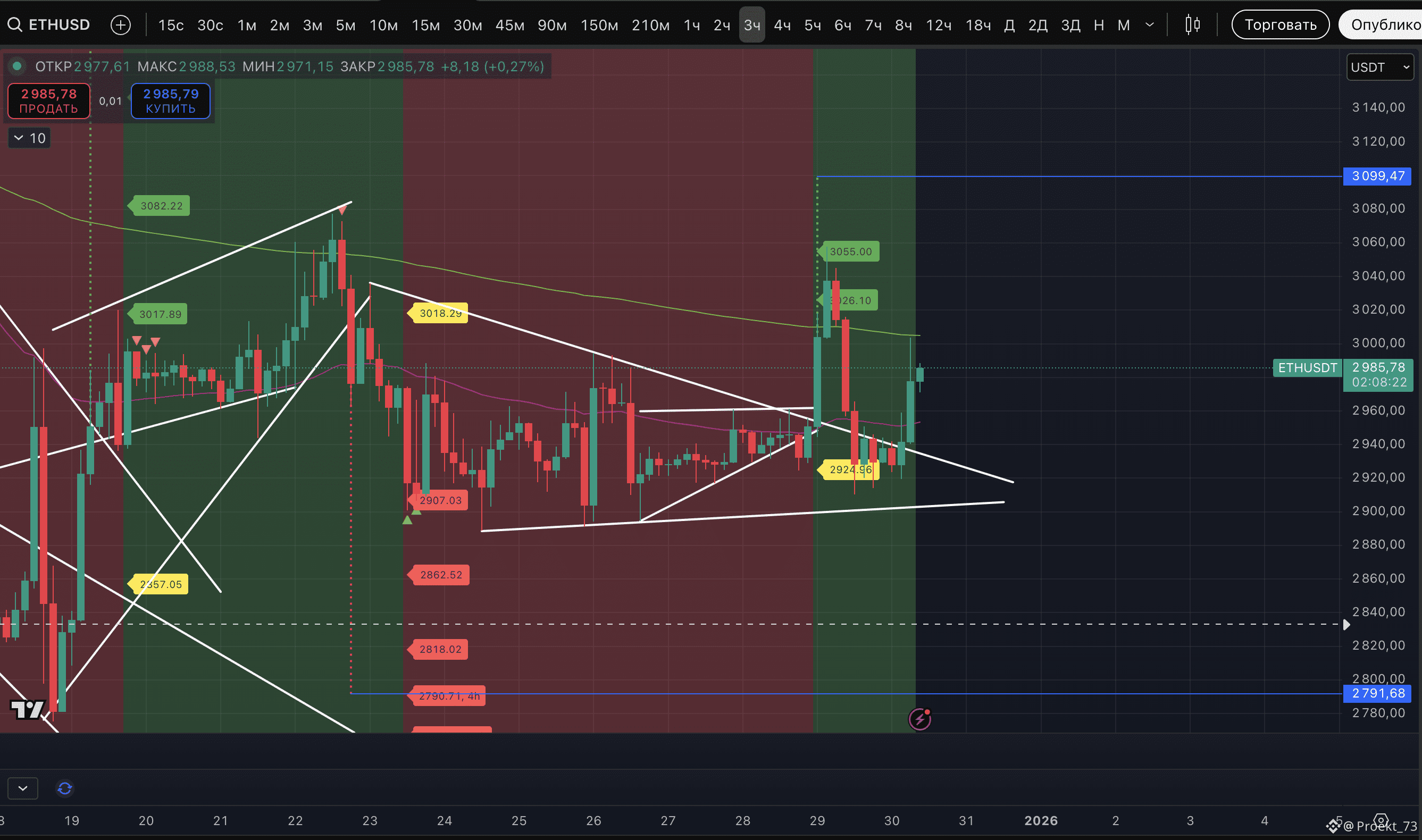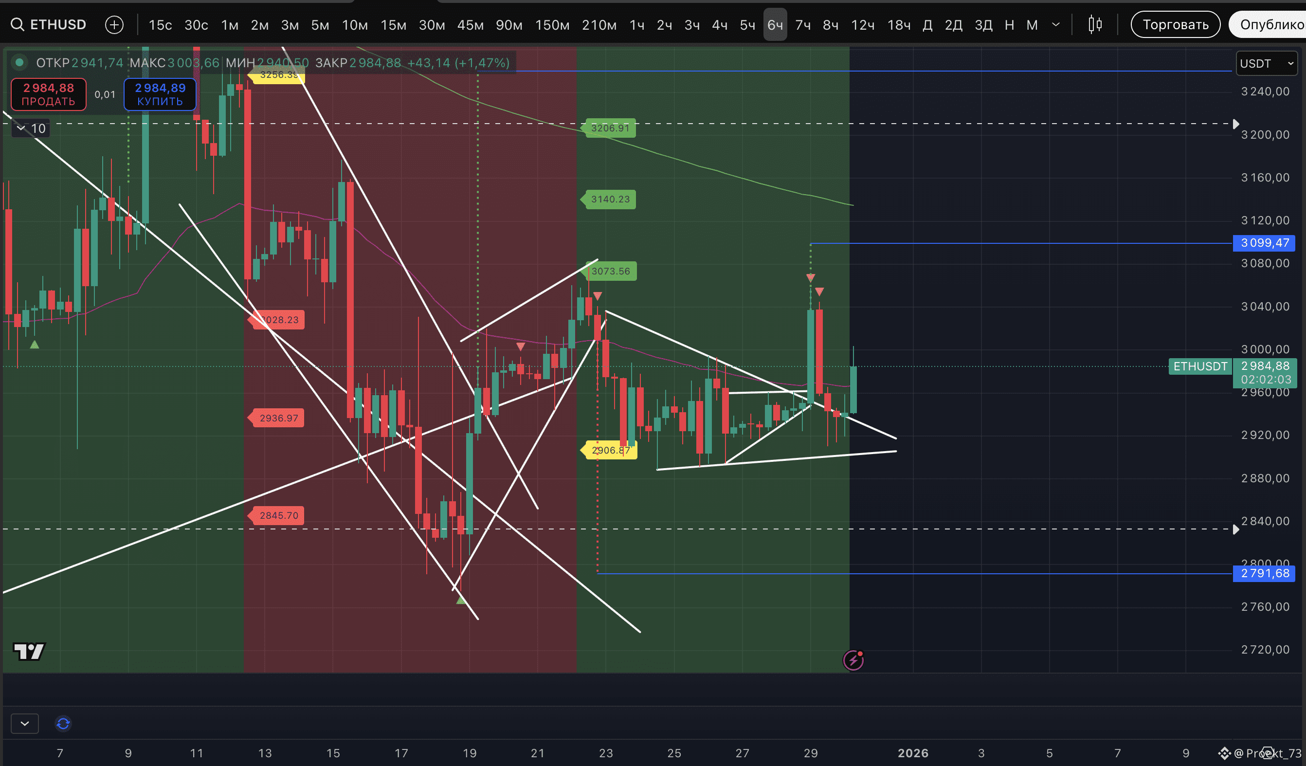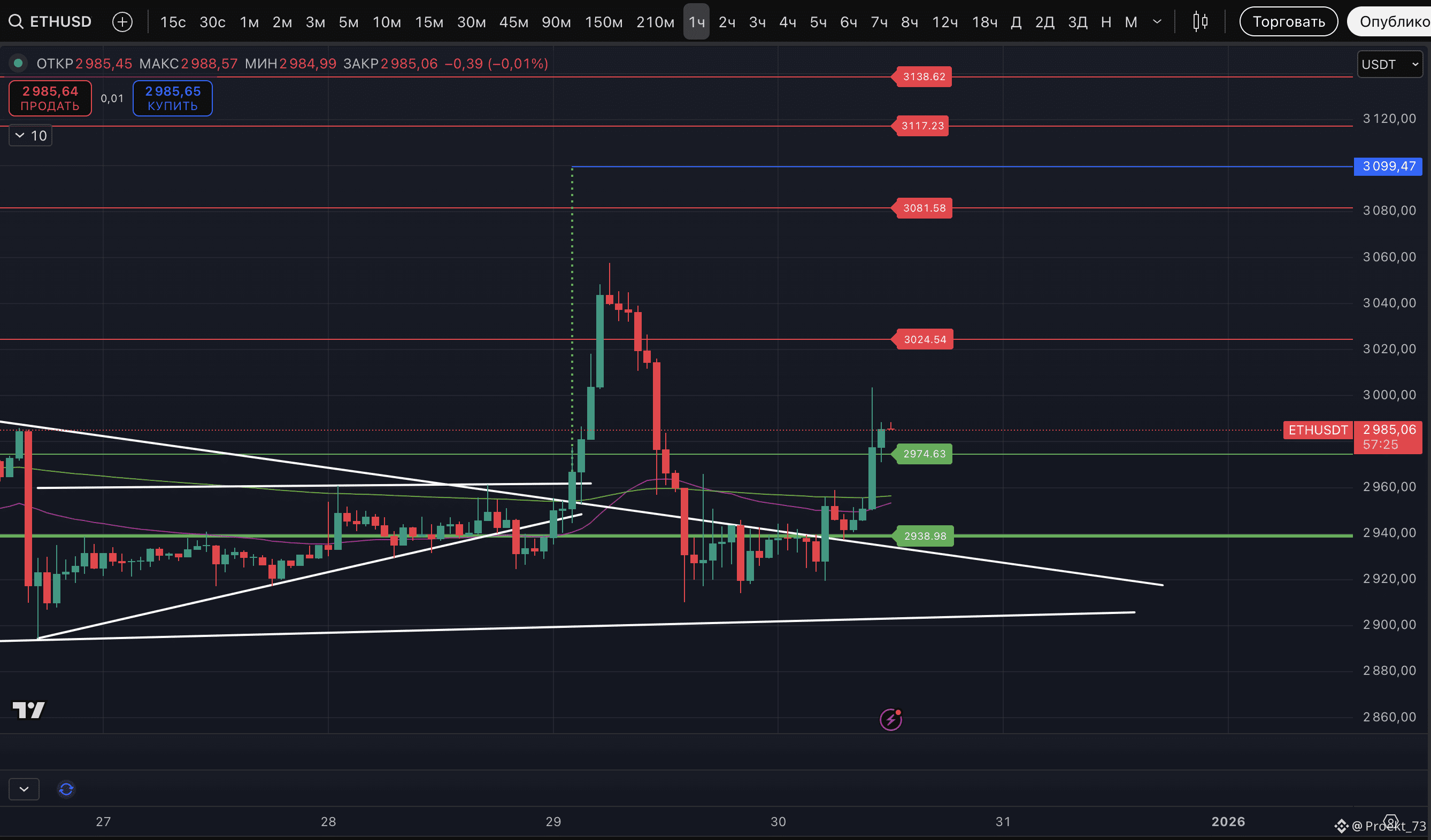 UPD по ETH на утро 30 декабря. За время коррекции вчера были удержаны уровни потенциального слома аптрендов на 3- и 4-часовом ТФ по нашему индикатору. Напомним, это 2 924$ и 2 925$ соответственно.