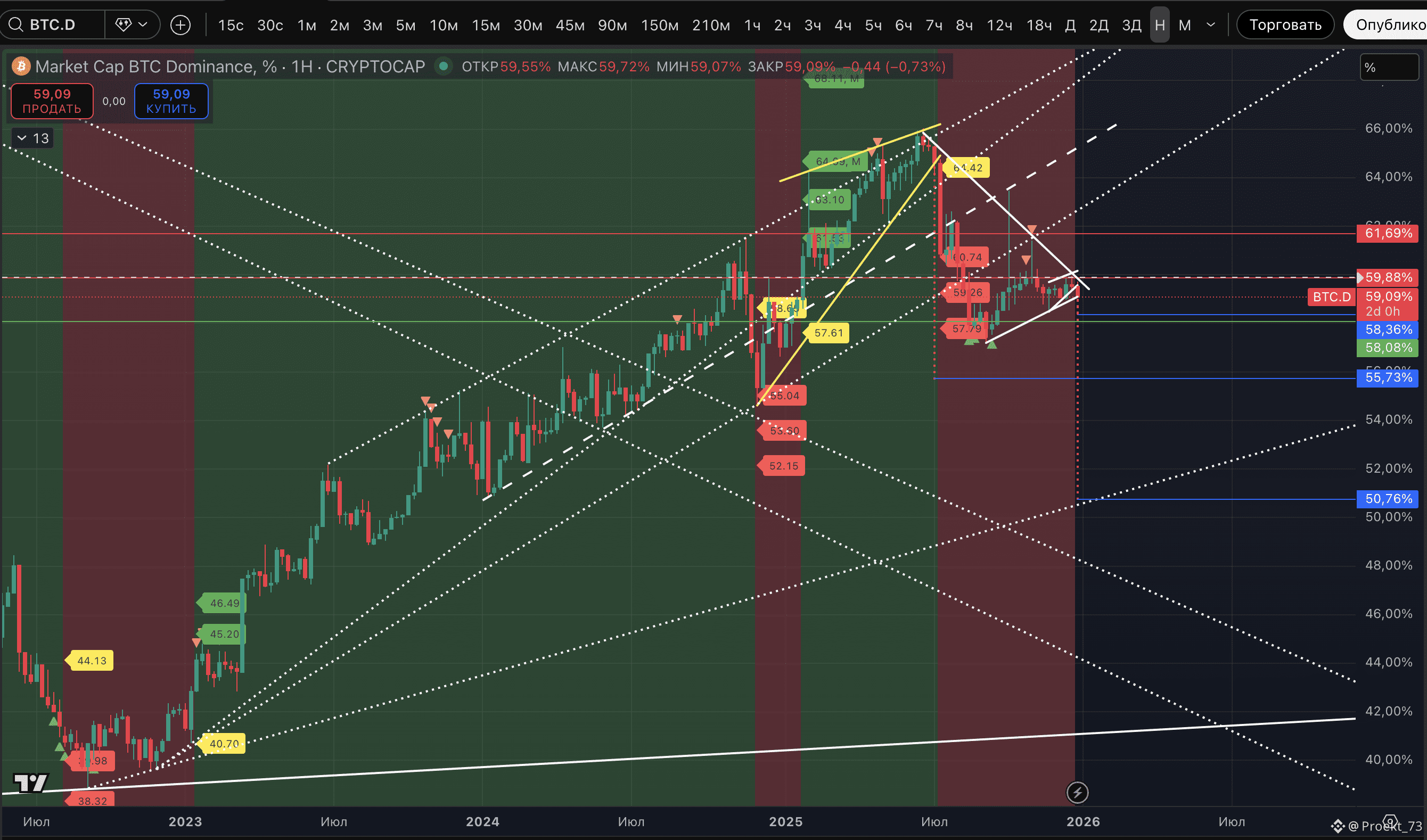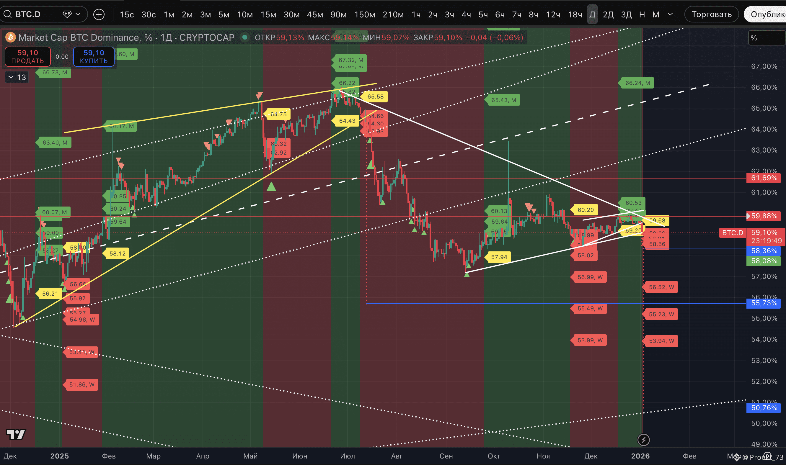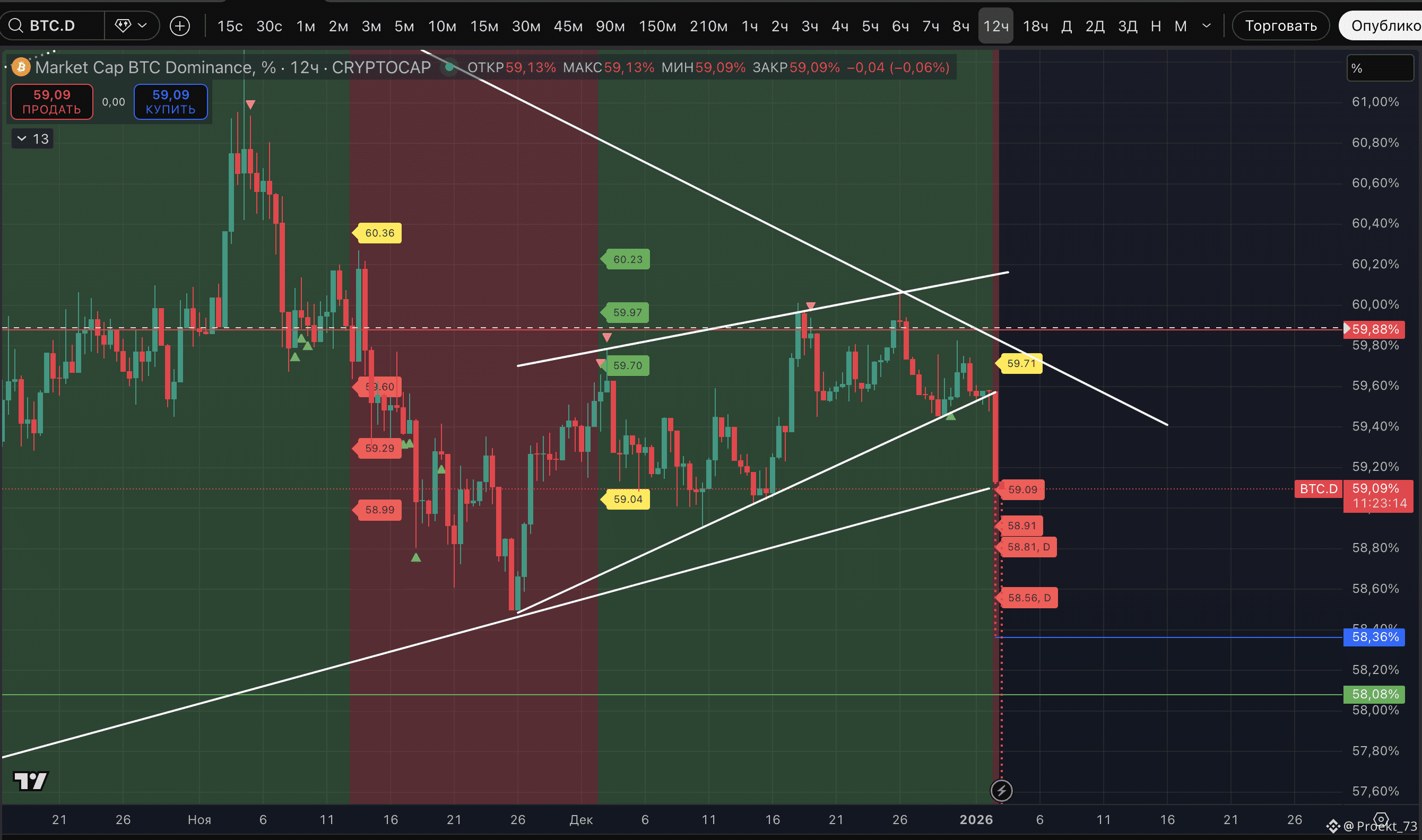 В обзоре 30 декабря писали, что там формируется "Медвежий клин" и ожидали сначала отскок (где важно было не пробить сопротивление 59,88%) и далее его отработку. В итоге - четкая отработка прогноза, через отскок до 59,83% доминация пробила клин и сейчас в его отработке. Полная цель - 58,36%.