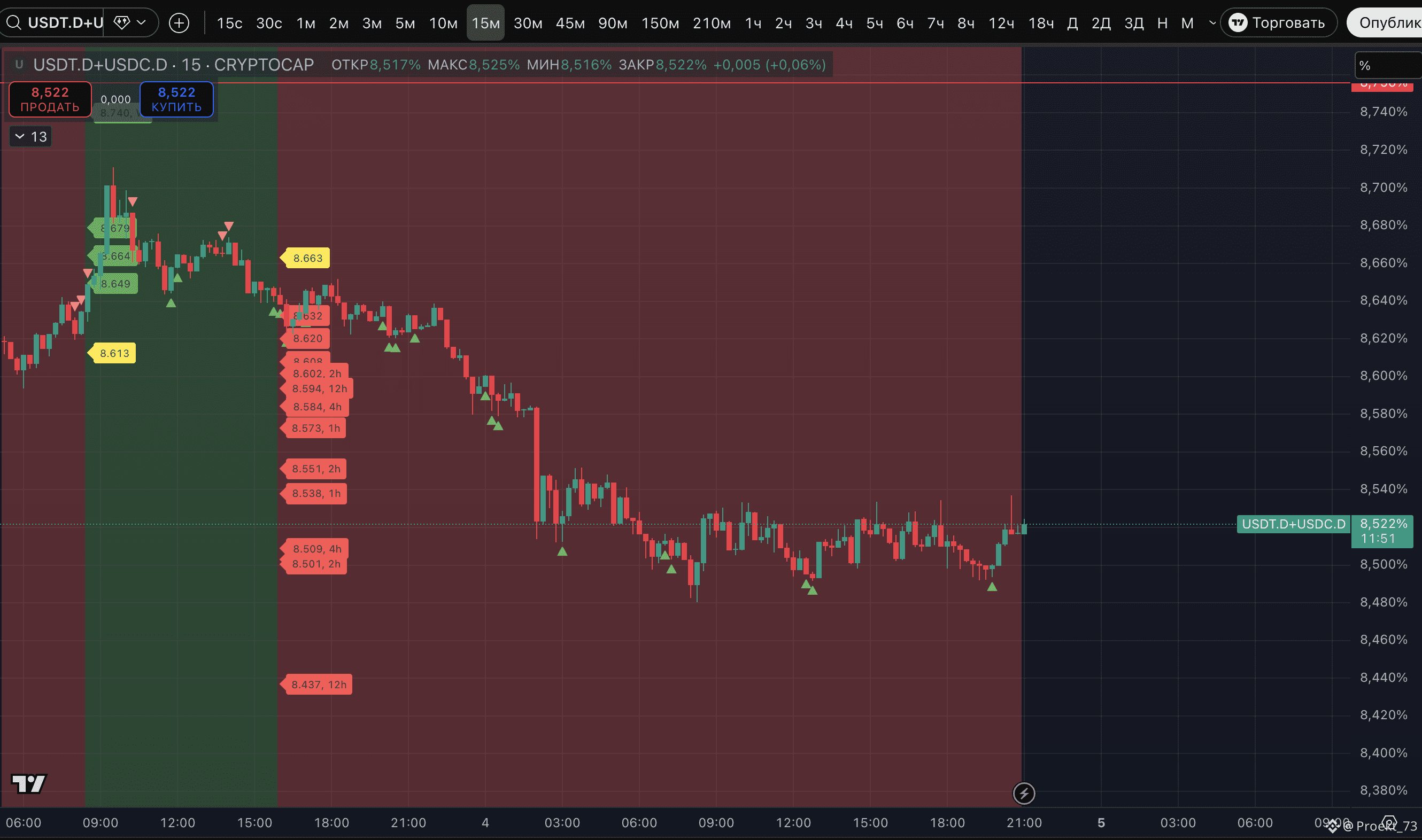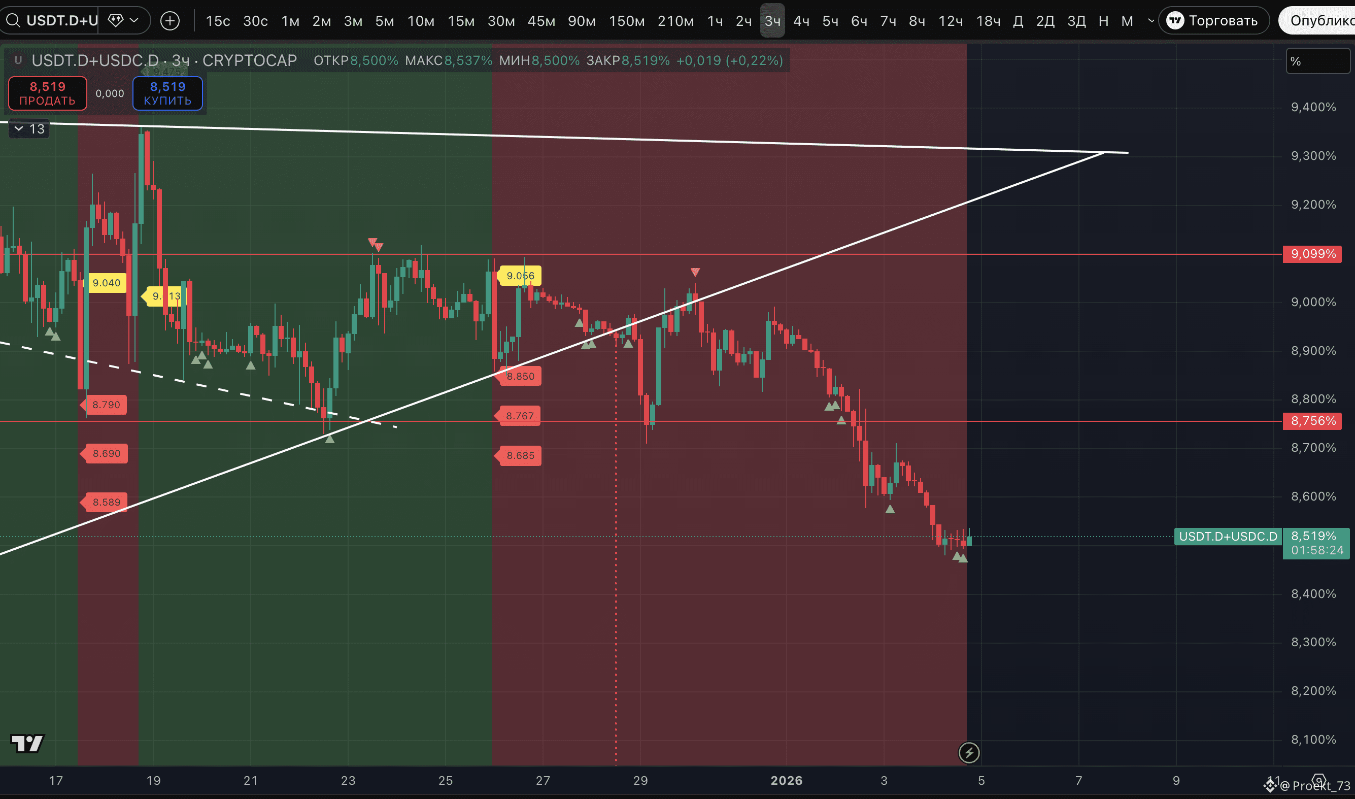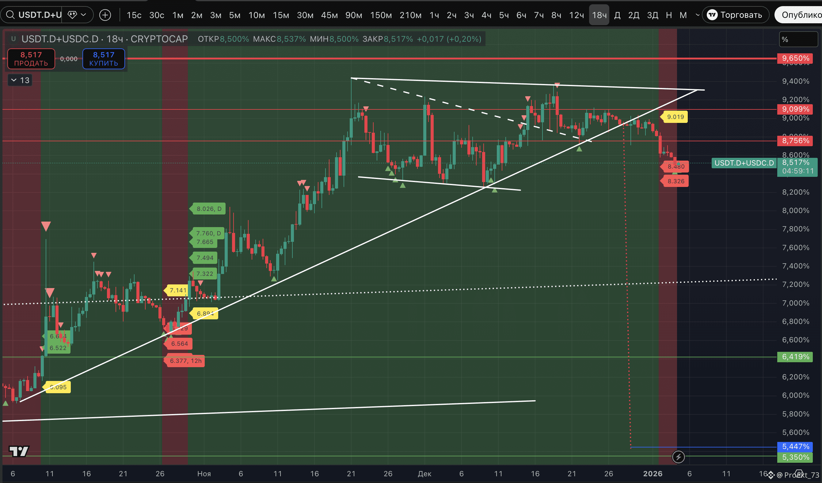 "... Проблемой для быков крипторынка сейчас по-прежнему выступает горизонтальный уровень 8,756%. Для старта реализации бычьего сценария на зиму доминации стейблкоинов нужно закрепляться под ним. И возвращение метрики в устойчивые даунтренды на ТФ от 12-часового и старше."