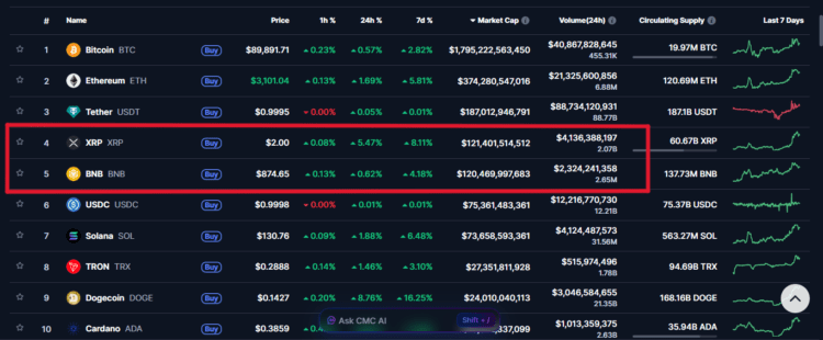 На момент написания этой статьи XRP имеет рыночную капитализацию более 121000000000 долларов США, в то время как BNB составляет около 120500000000 долларов США.