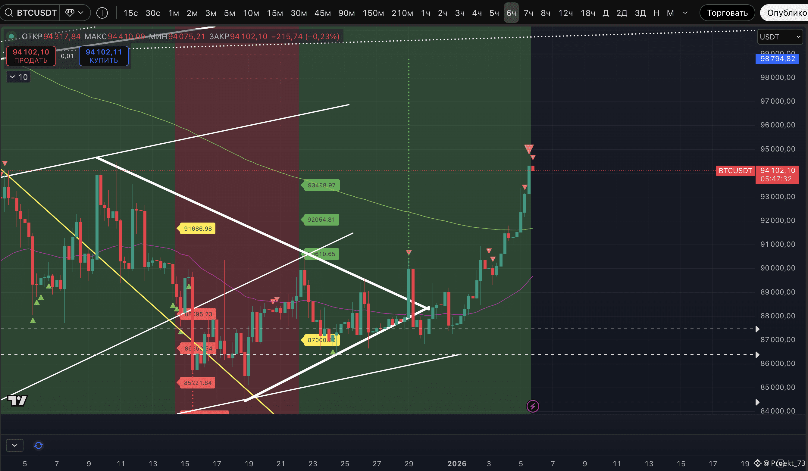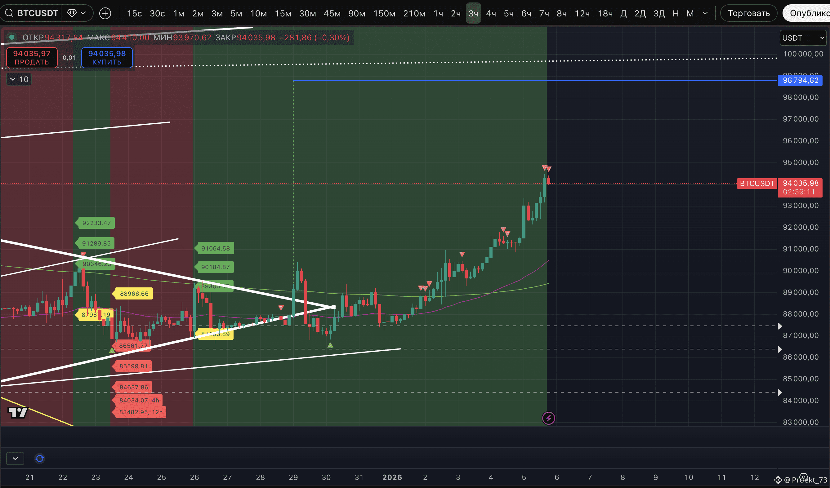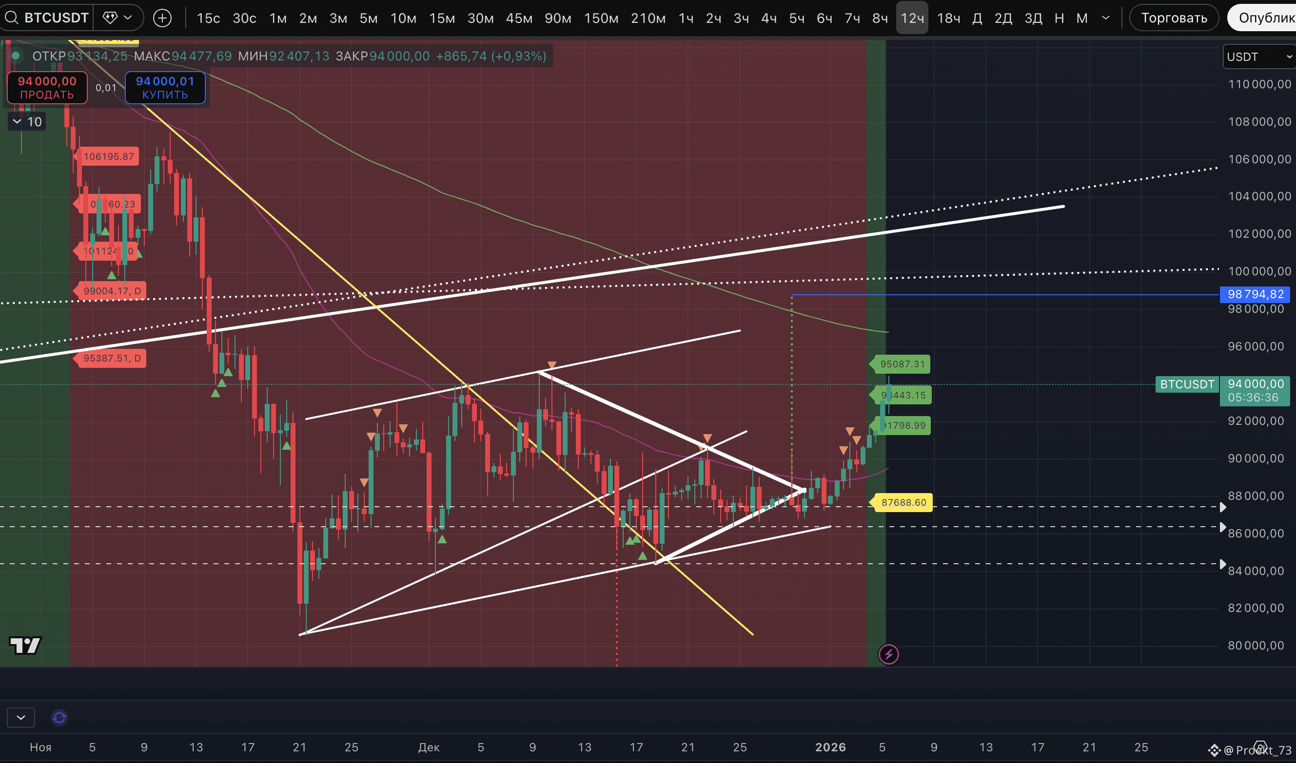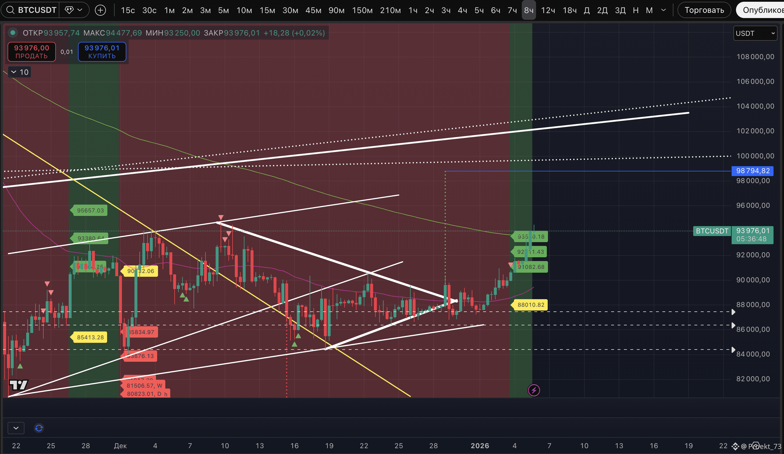 Собраны три базовые цели аптрендов на 8-часовом ТФ, а на 12-часовом ТФ остается еще одна цель 95 087$.
