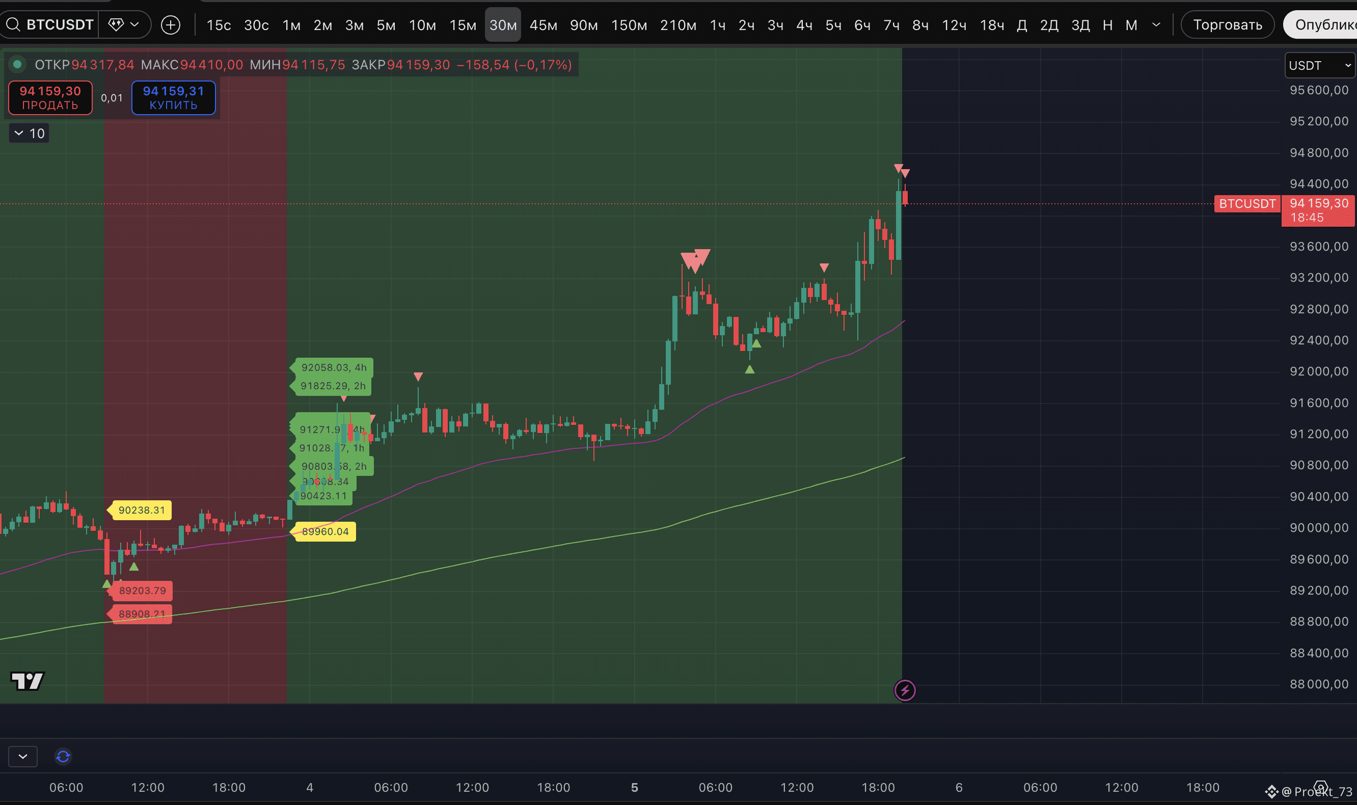 - Две метки потенциального хая на 30-минутном ТФ.