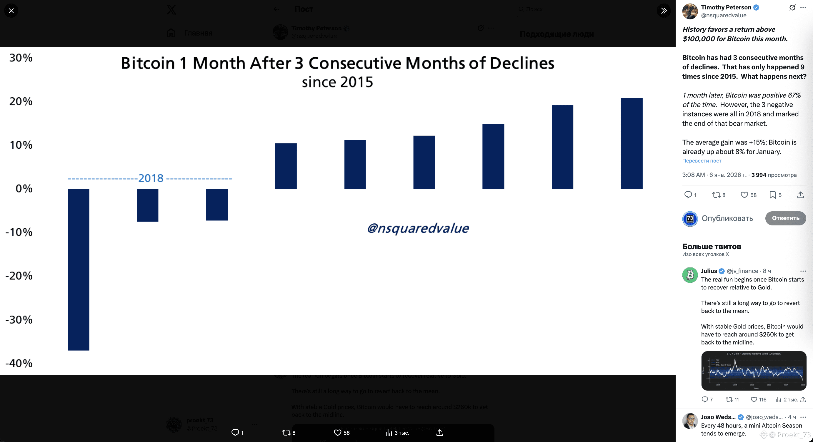 По его оценке история "поддерживает" возврат #BTC выше 100 000$ уже в этом месяце. Отдельно Питерсон отмечает, что январь уже показывает примерно на +8%. Еще не +15%, но явно позитивное движение.