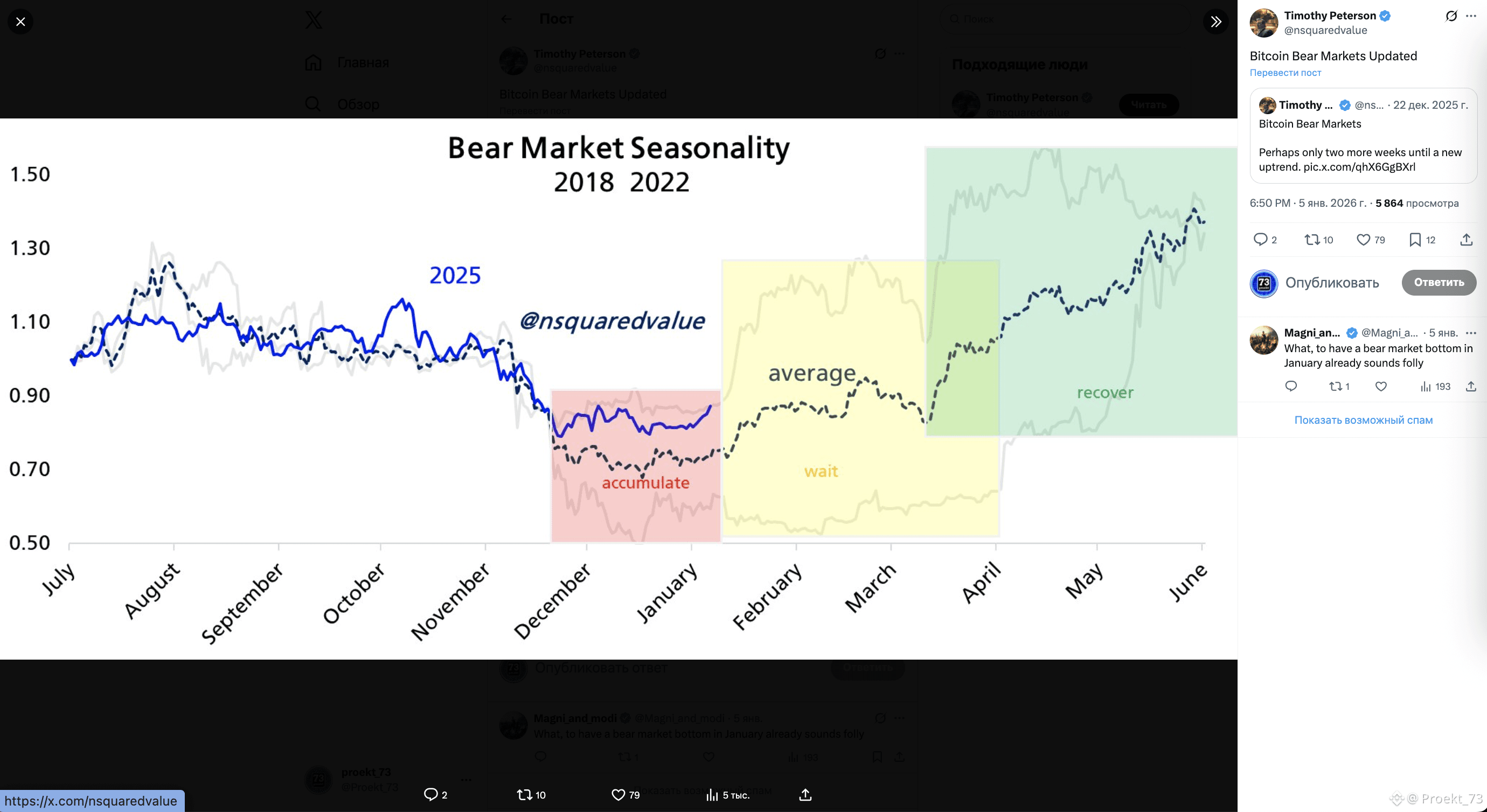 Он снова достал в качестве аргумента свою любимую цикличность BTC и сравнивает текущую траекторию с медвежьими фазами 2018 и 2022, накладывая сезонную матрицу на ближайшие месяцы.